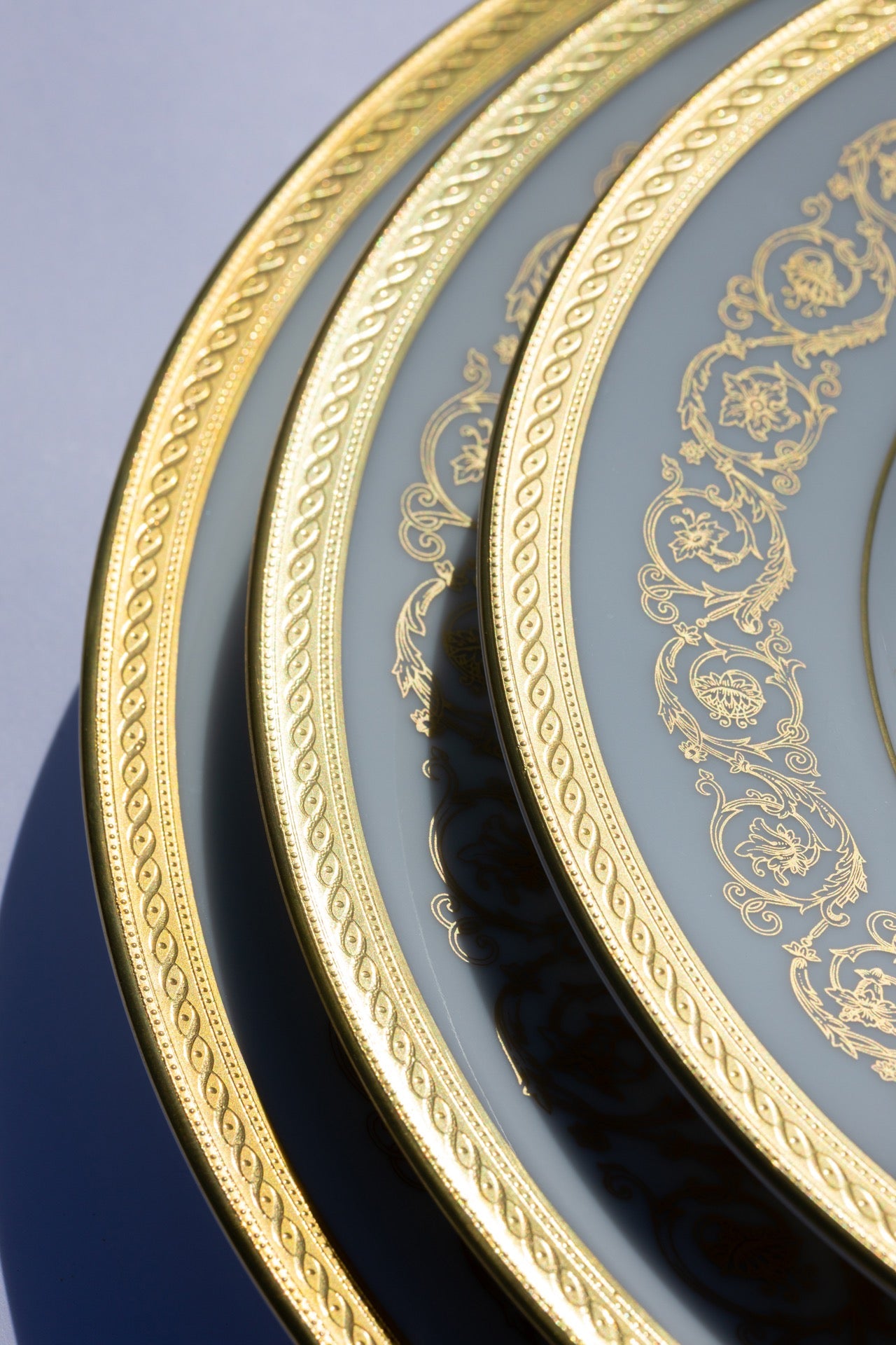 Each piece in the Ambassade collection reflects the heritage of meticulous craftsmanship, offering a palette of customizable colors suited to both contemporary and ceremonial settings. Explore the collection and bring depth, elegance, and the brilliance of masterful goldwork to your table.