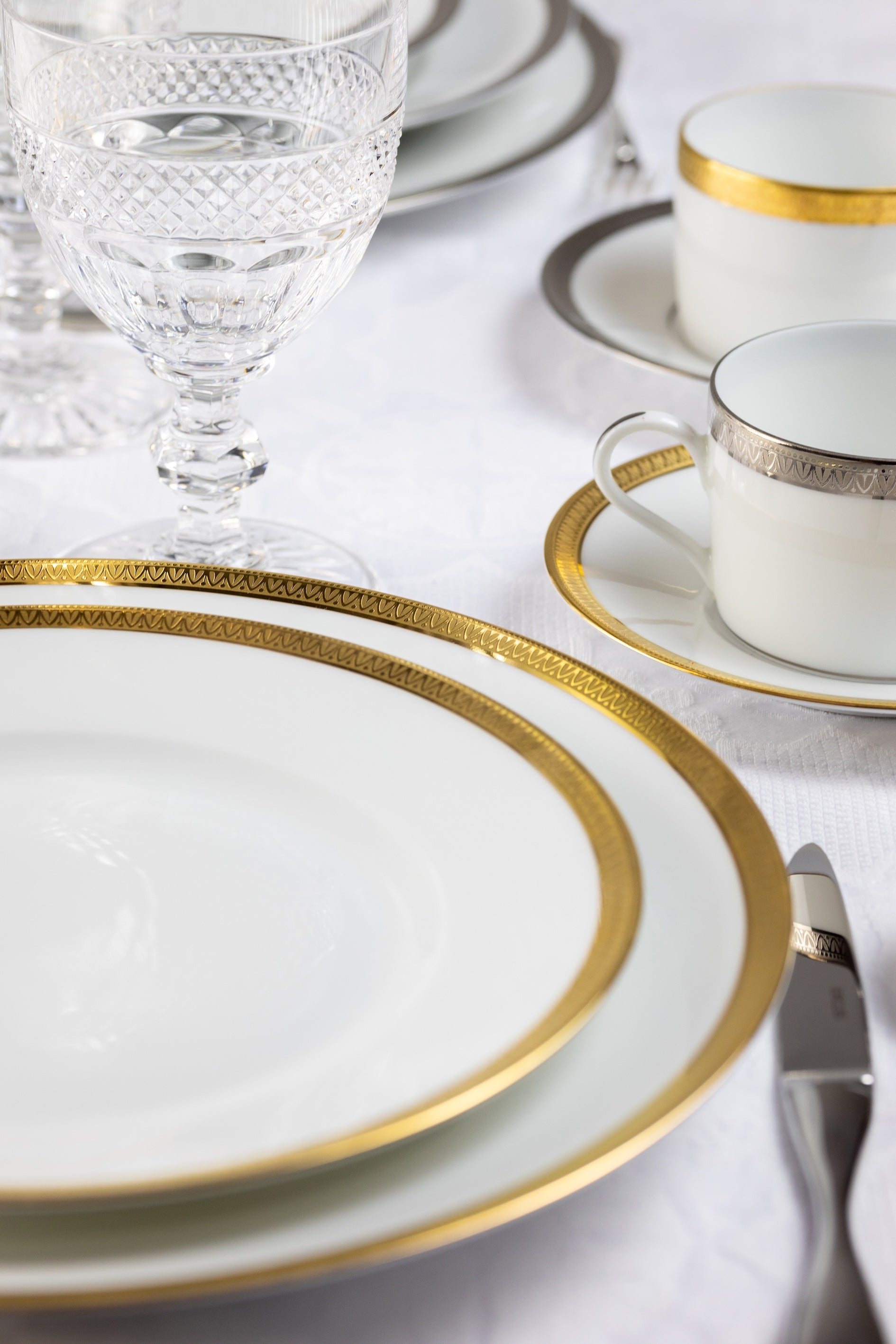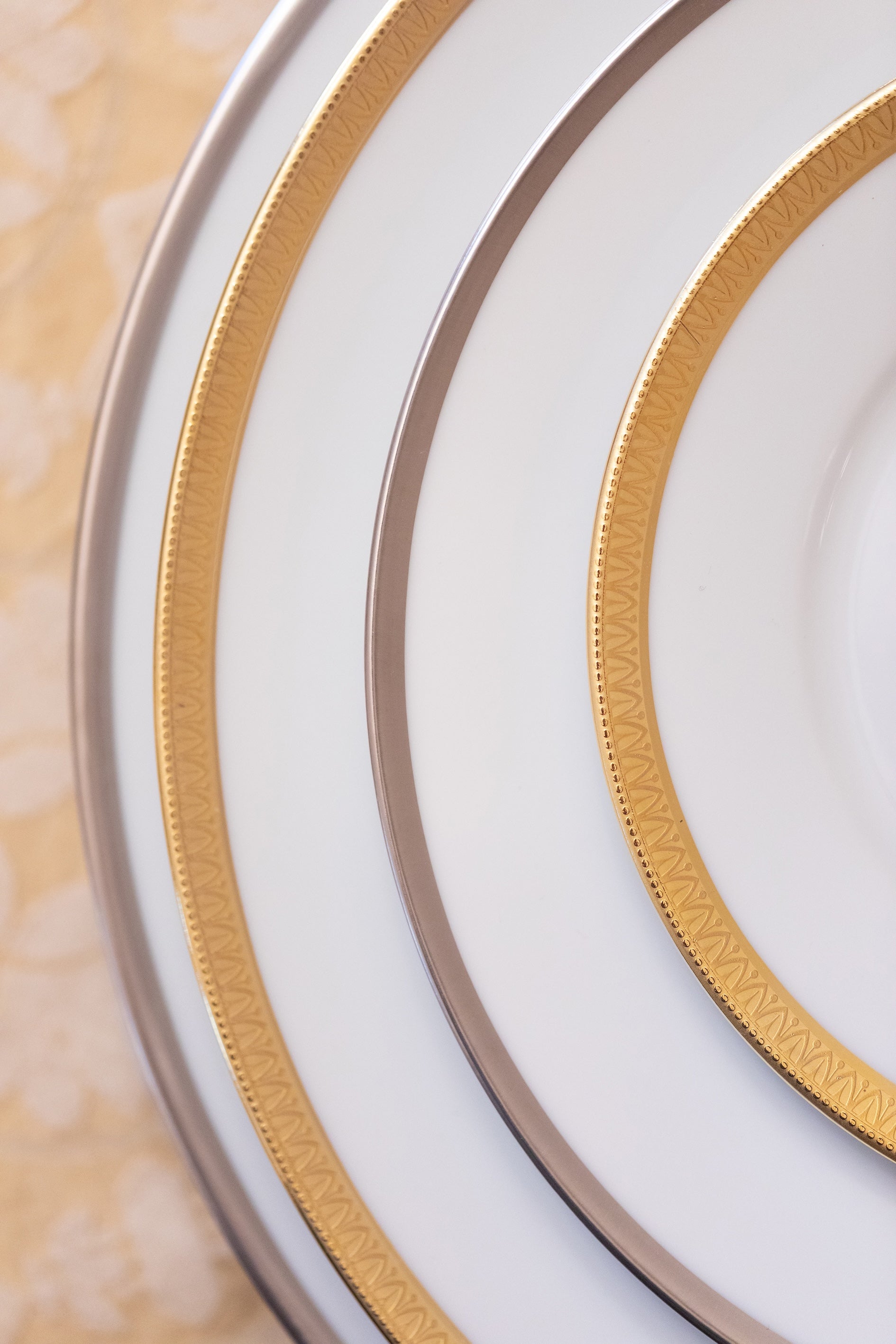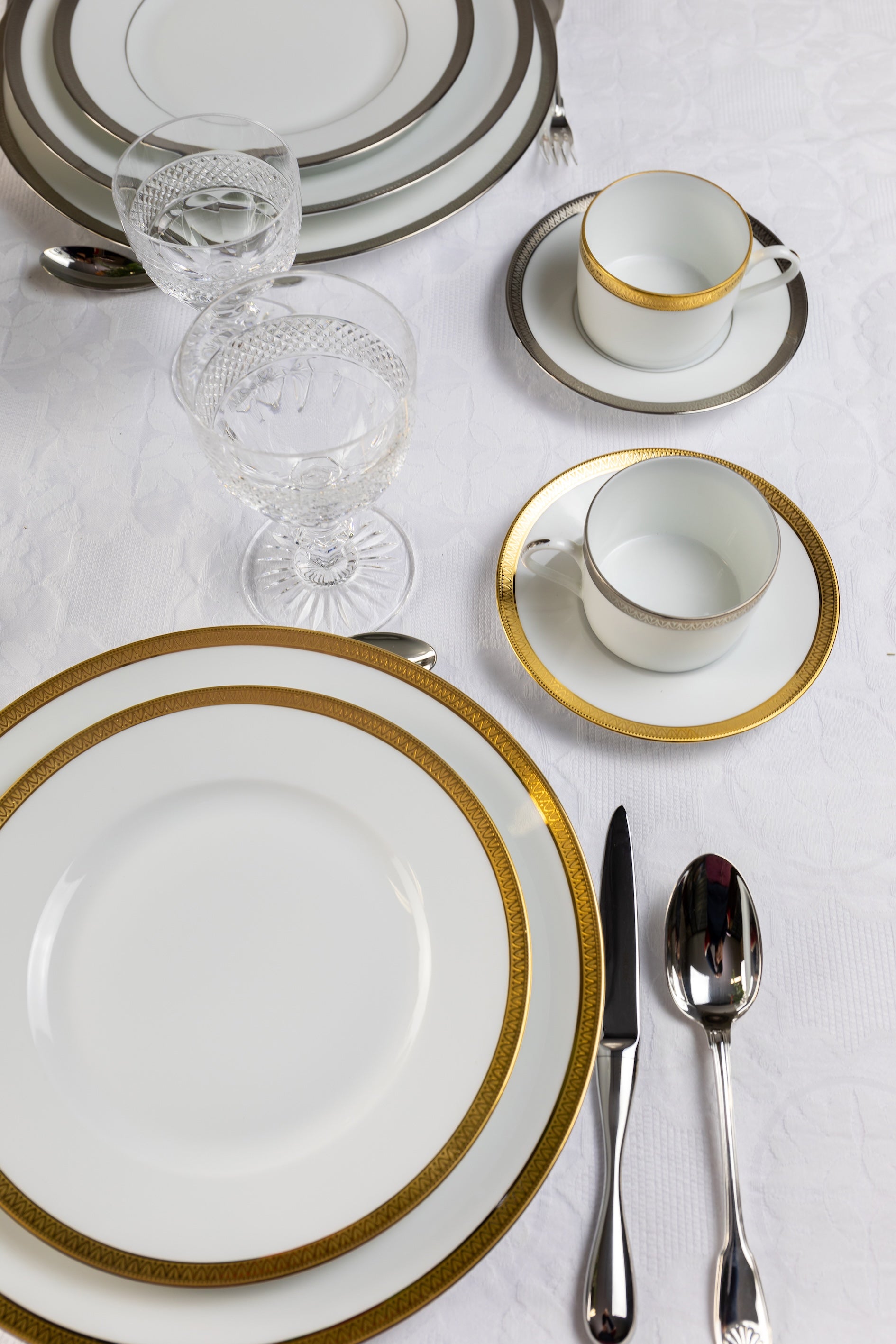 The Malmaison collection by Robert Haviland & C. Parlon draws inspiration from the storied Château de la Malmaison, once the residence of Joséphine de Beauharnais and Napoléon Bonaparte. Rendered in two distinguished finishes—sumptuous Gold and refined Platinum—with elegant filet detailing, each piece is meticulously hand-decorated on fine Limoges porcelain. The result is a graceful interplay of heritage and sophistication, perfect for creating settings that whisper of imperial elegance.