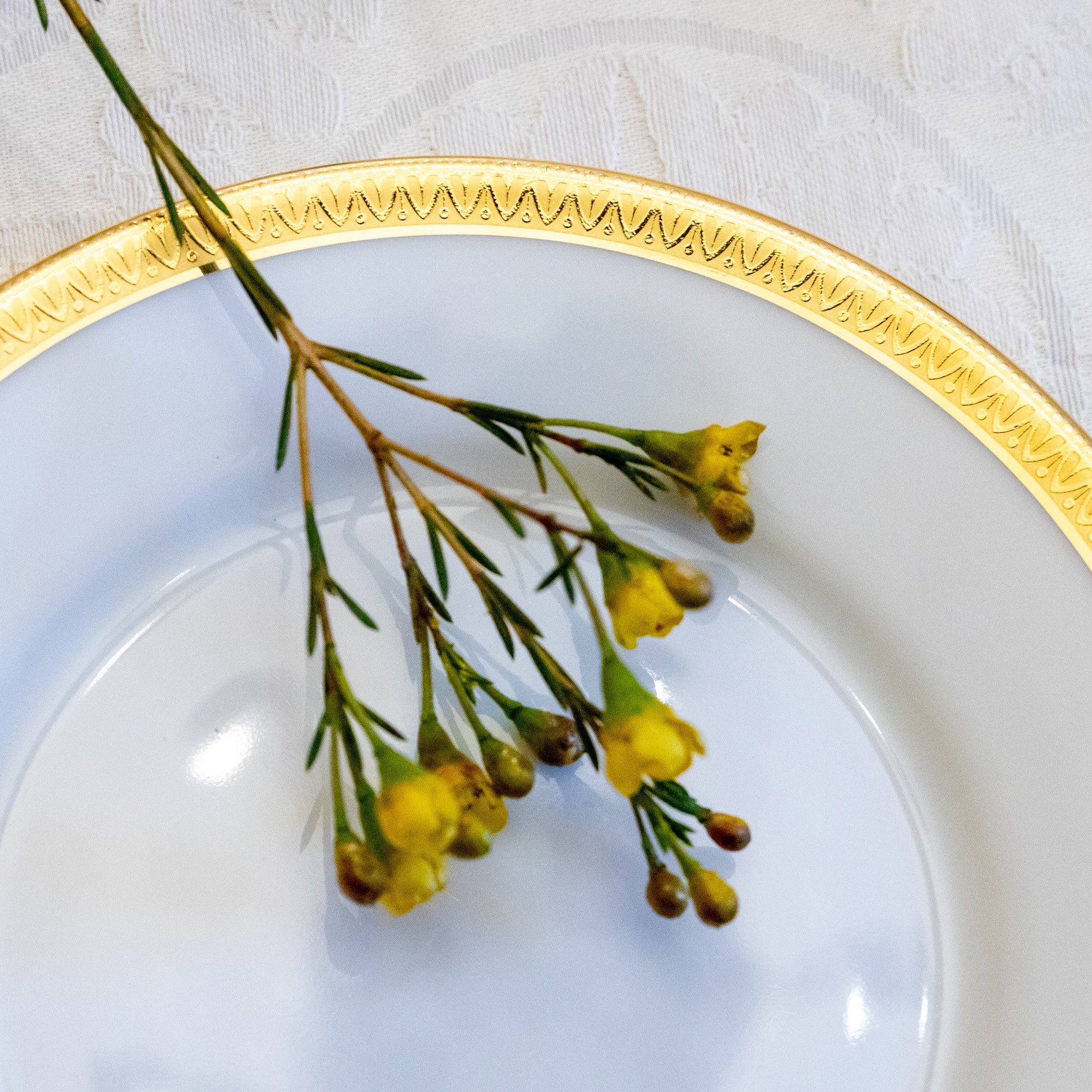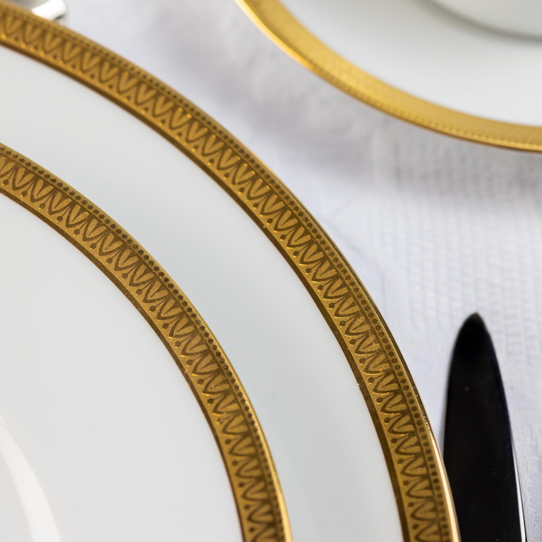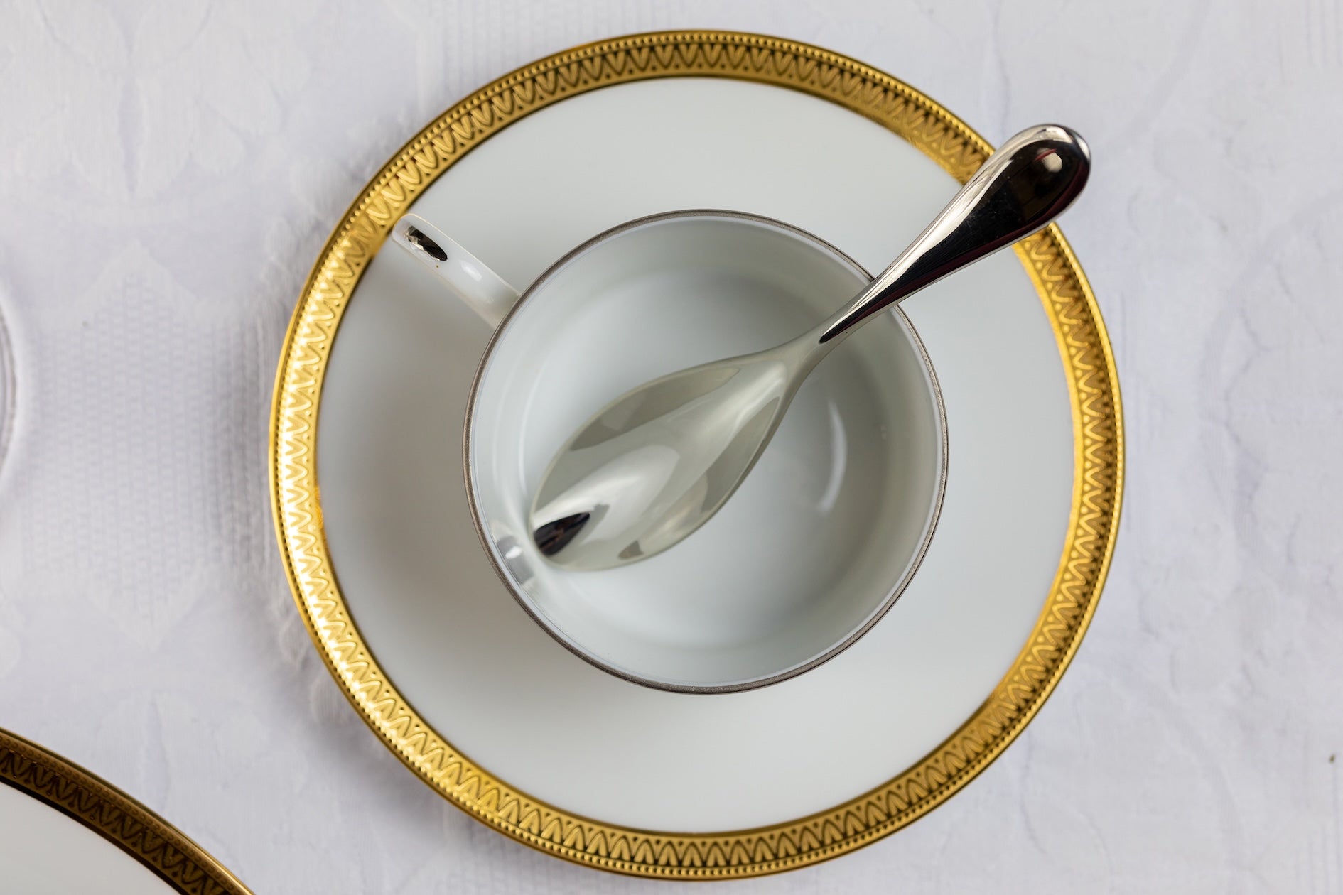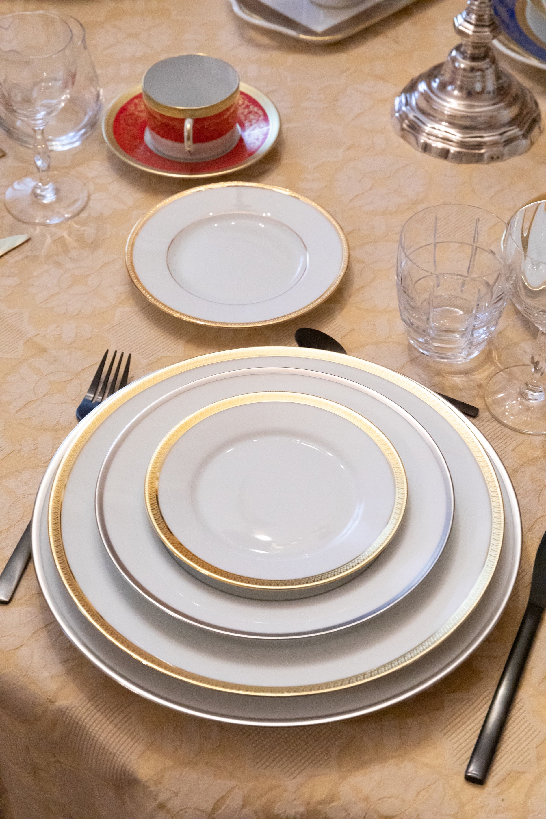 The Malmaison collection by Robert Haviland & C. Parlon draws inspiration from the storied Château de la Malmaison, once the residence of Joséphine de Beauharnais and Napoléon Bonaparte. Rendered in two distinguished finishes—sumptuous Gold and refined Platinum—with elegant filet detailing, each piece is meticulously hand-decorated on fine Limoges porcelain. The result is a graceful interplay of heritage and sophistication, perfect for creating settings that whisper of imperial elegance.