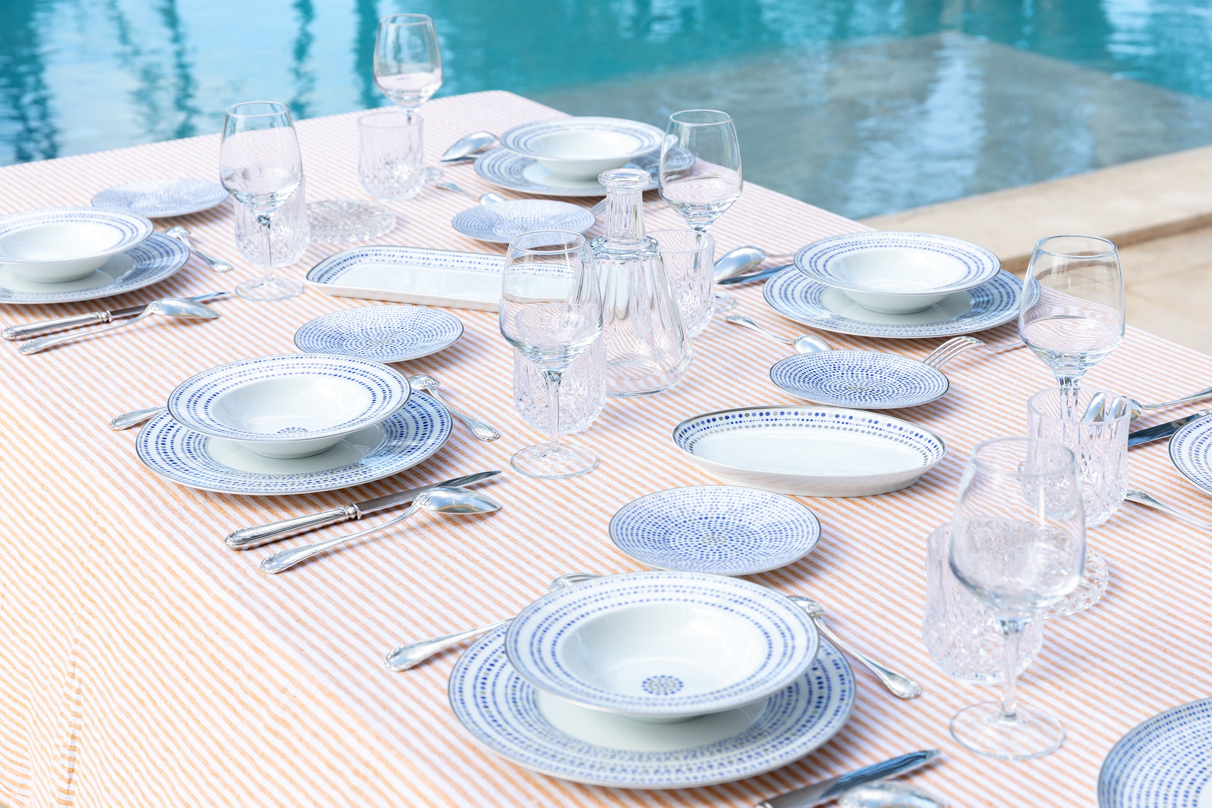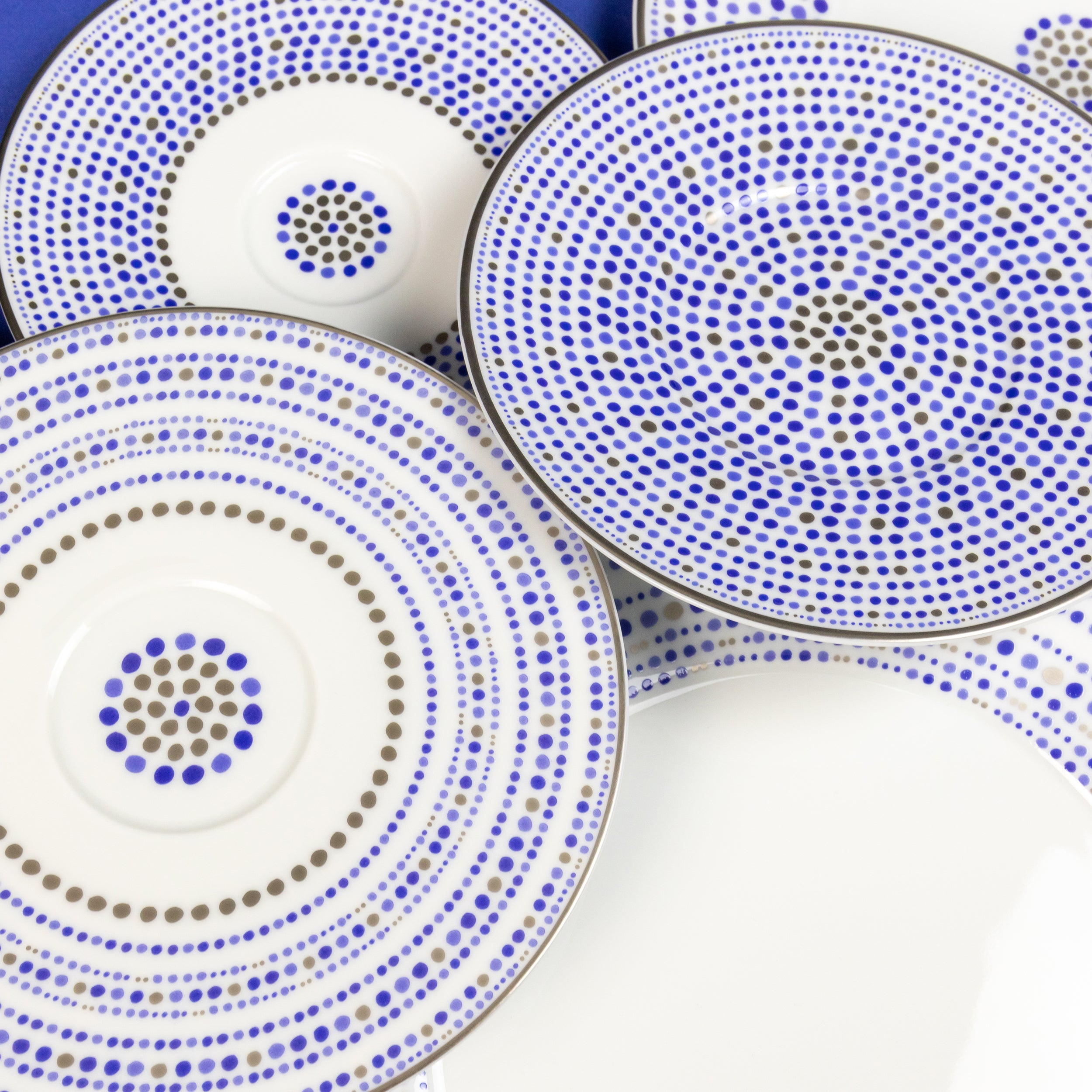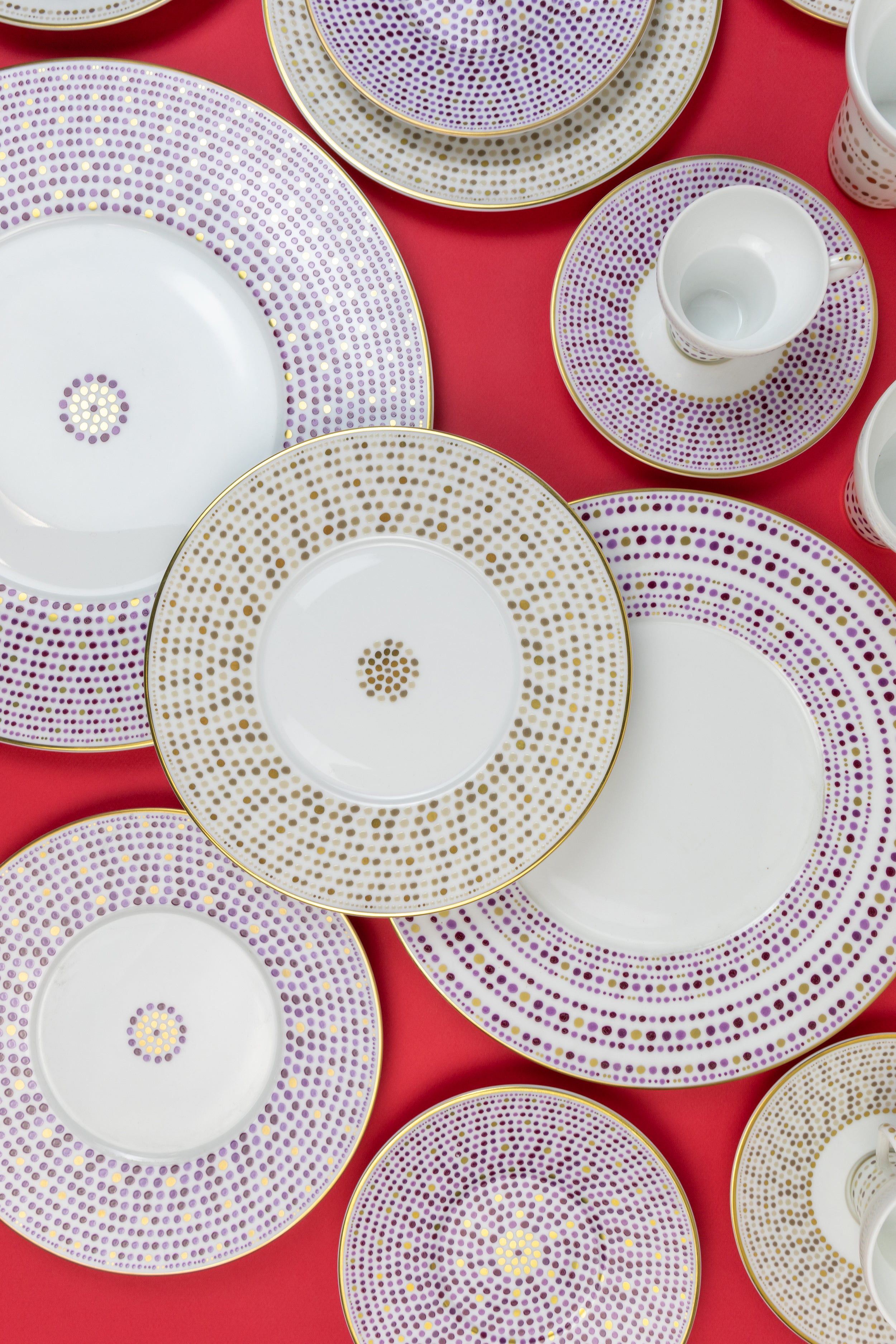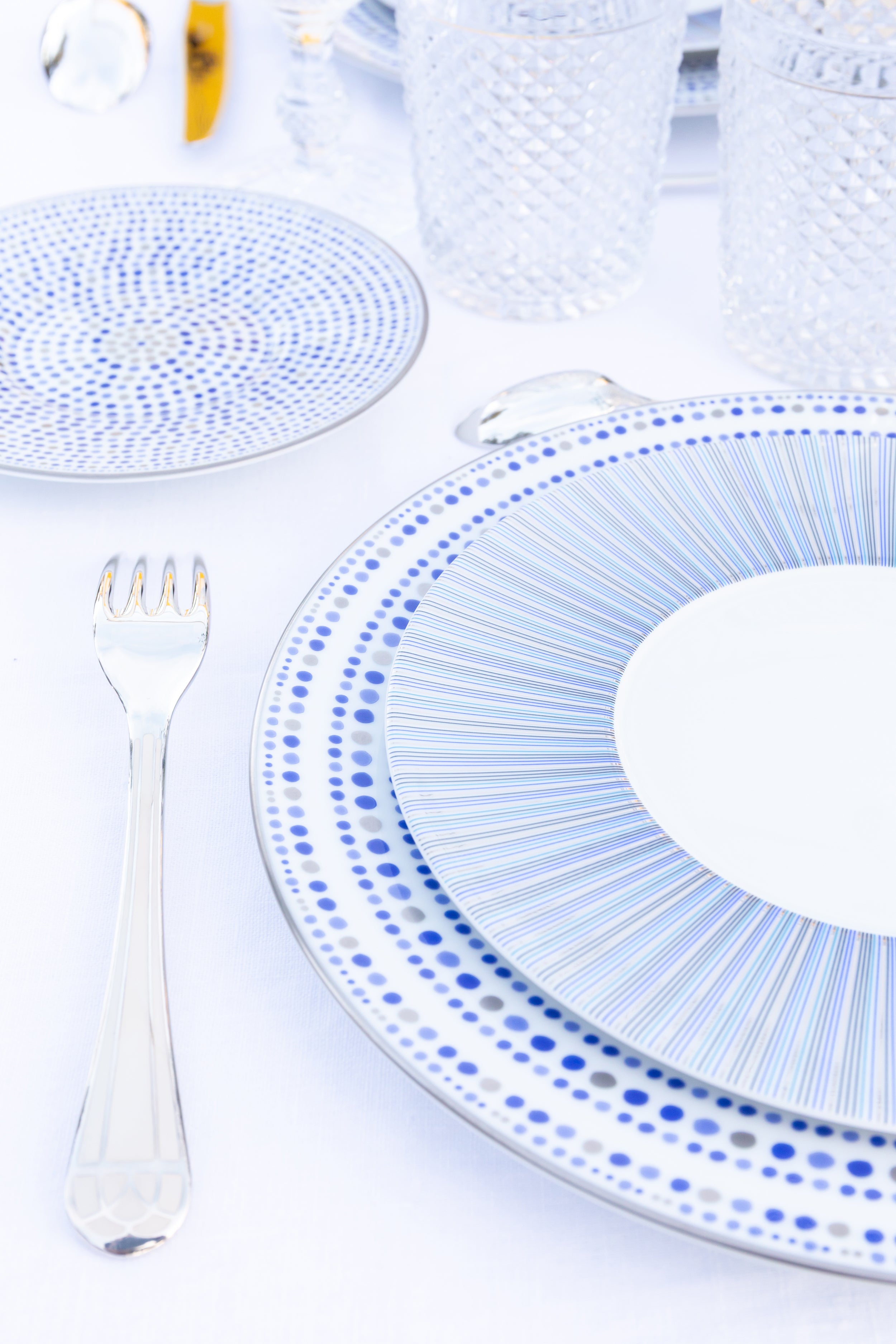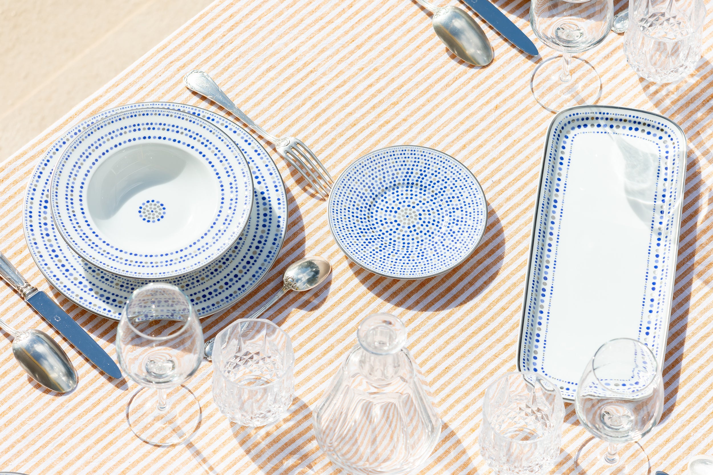 The Villa Toscana collection by Robert Haviland & C. Parlon, conceived by artist Stefany Bellamy, brings a breath of modern elegance to the table. This fresh summer décor features spirited dots in indigo, cassis, and mastic gracefully hand-applied onto fine Limoges porcelain, creating a strikingly graphic yet lighthearted pattern. Conceived to evoke the relaxed charm of Mediterranean villas, each piece bears the clarity and sophistication that define the maison’s artisan heritage.
