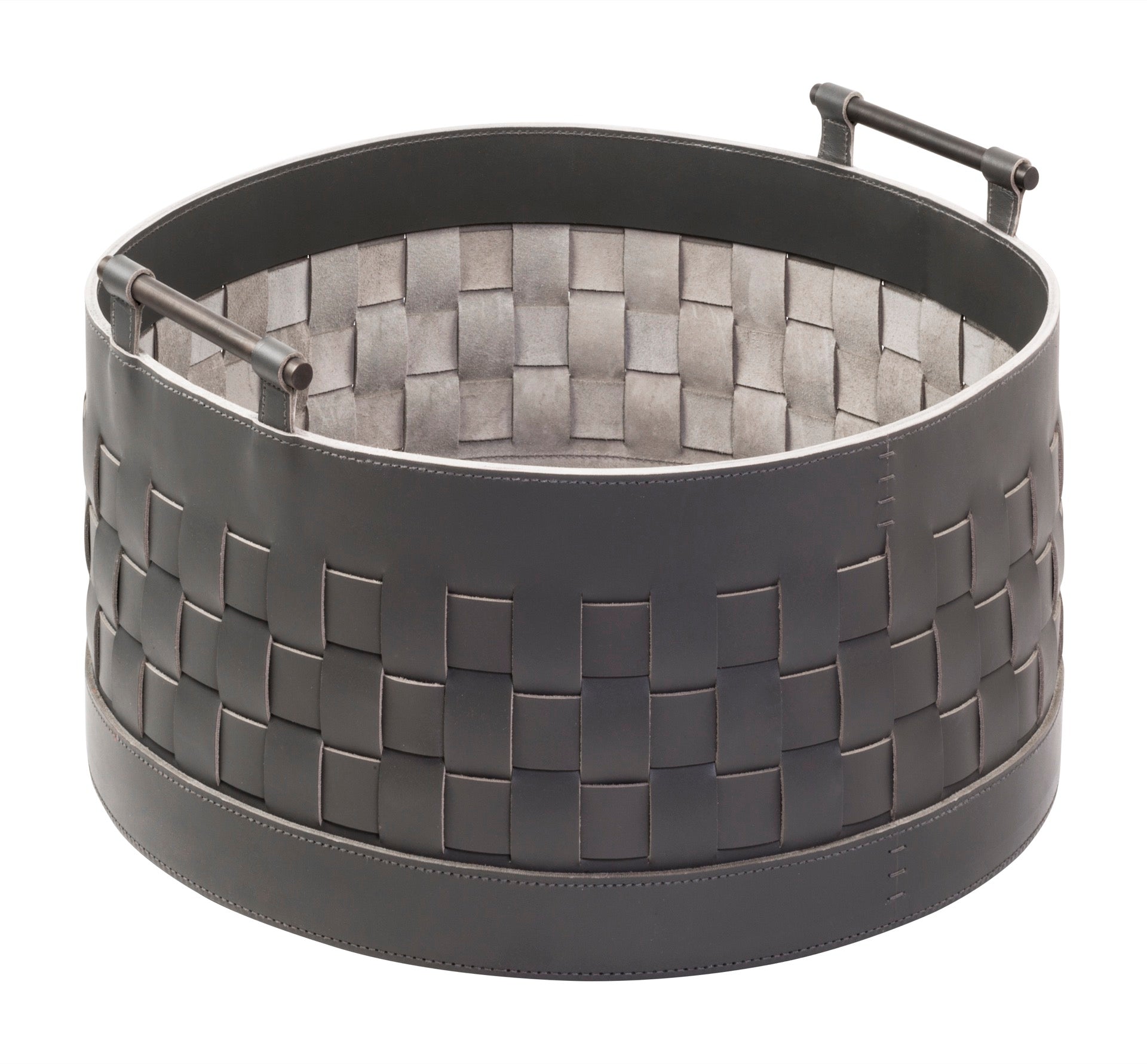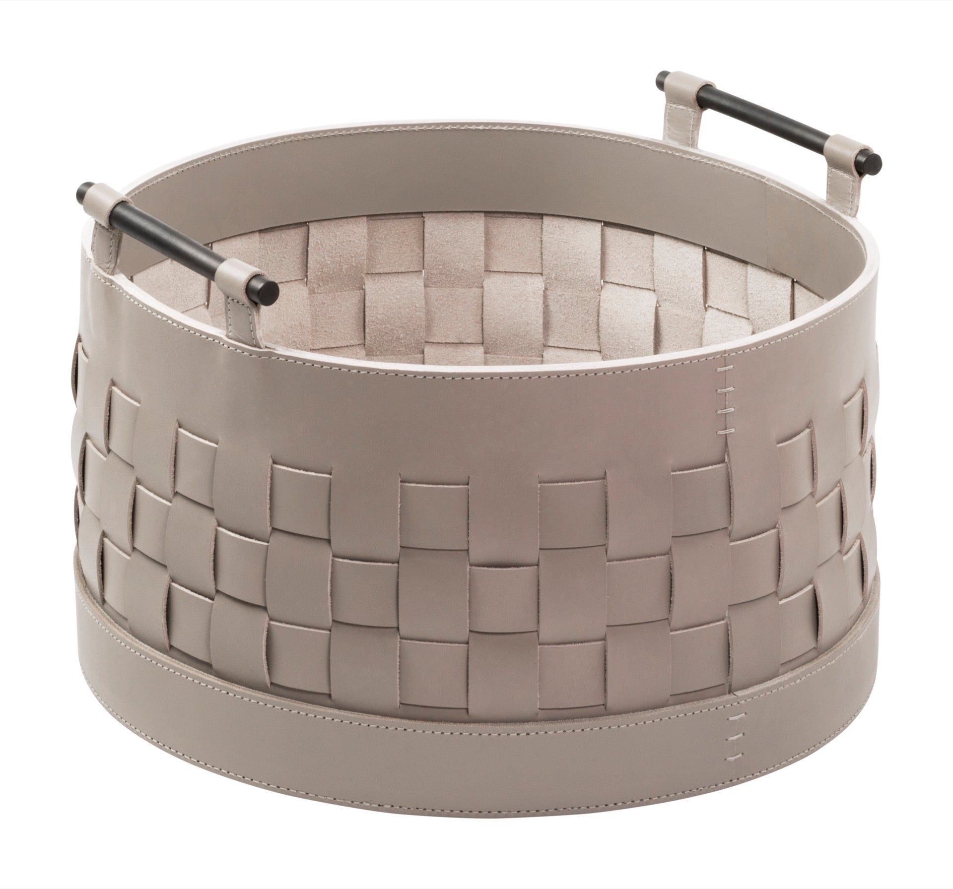 RABITTI 1969 – Ravenna Aufbewahrungskorb aus geflochtenem Leder, rund, niedrig, mit Griffen aus gebürsteter Bronze