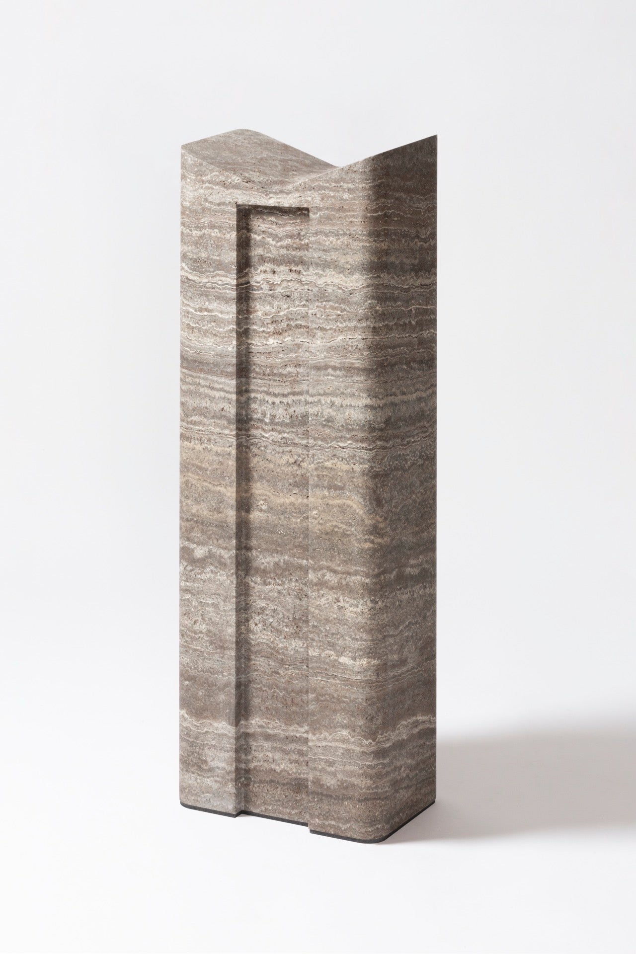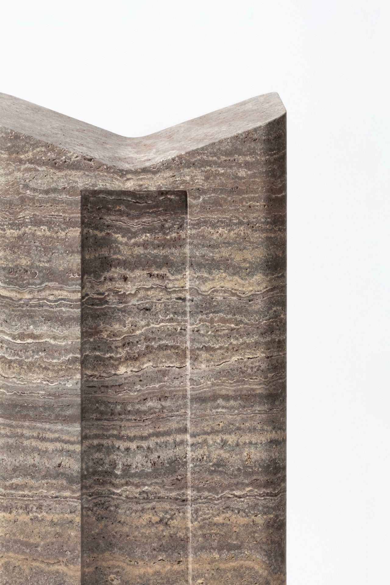 Ein nahtloser, aus einem einzigen Material gefertigter Buchständer, vollständig aus Travertinmarmor. Der Lloyd Bookstand von Giobagnara x Glenn Sestig vereint Form und Funktion in Stein und bietet sowohl einen präzisen Betrachtungswinkel als auch eine markante architektonische Silhouette.