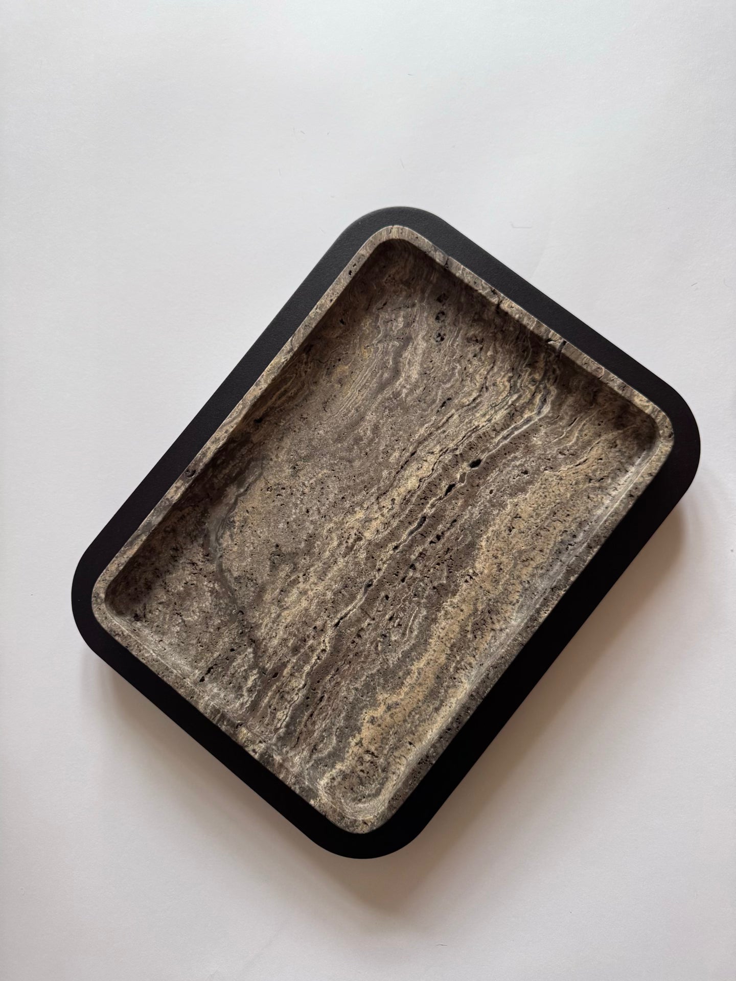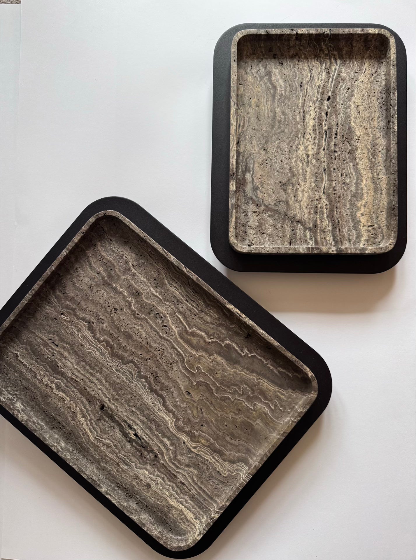 x Glenn Sestig Lloyd Tablett: Travertinmarmor mit brüniertem Bronzerahmen, rechteckig