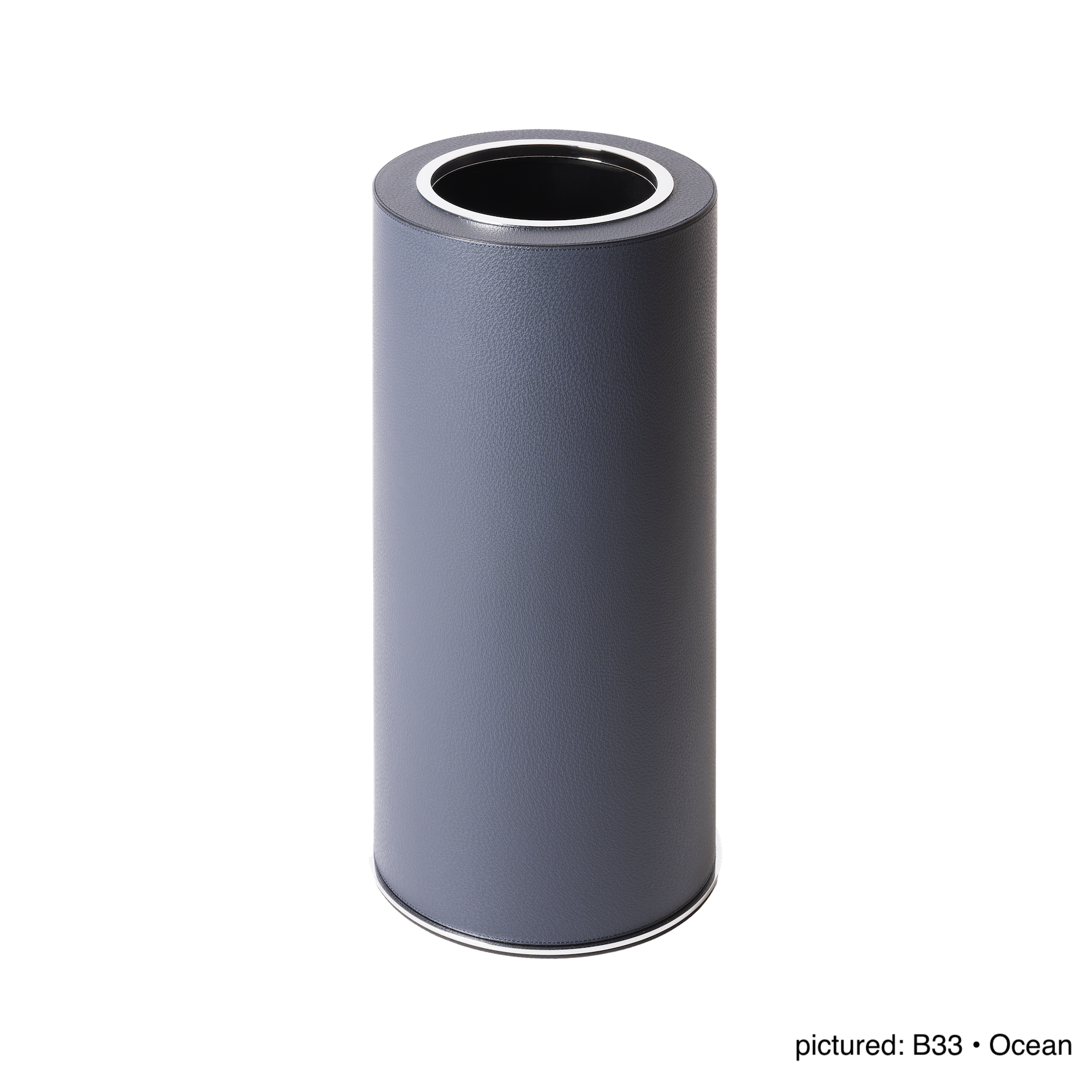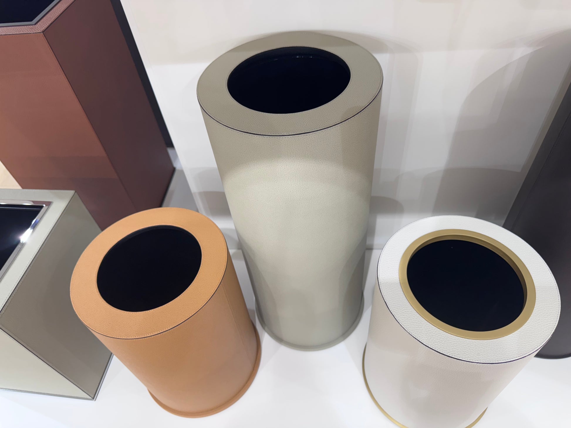 La poubelle double paroi en métal Positano de Giobagnara associe le cuir à un rebord métallique affirmé, apportant une touche d'élégance à sa forme cylindrique. Son bac amovible la rend très pratique. 2Jour Concierge utilise le modèle le plus petit dans les salles de bain des invités et le plus grand dans les salons ou les bureaux.