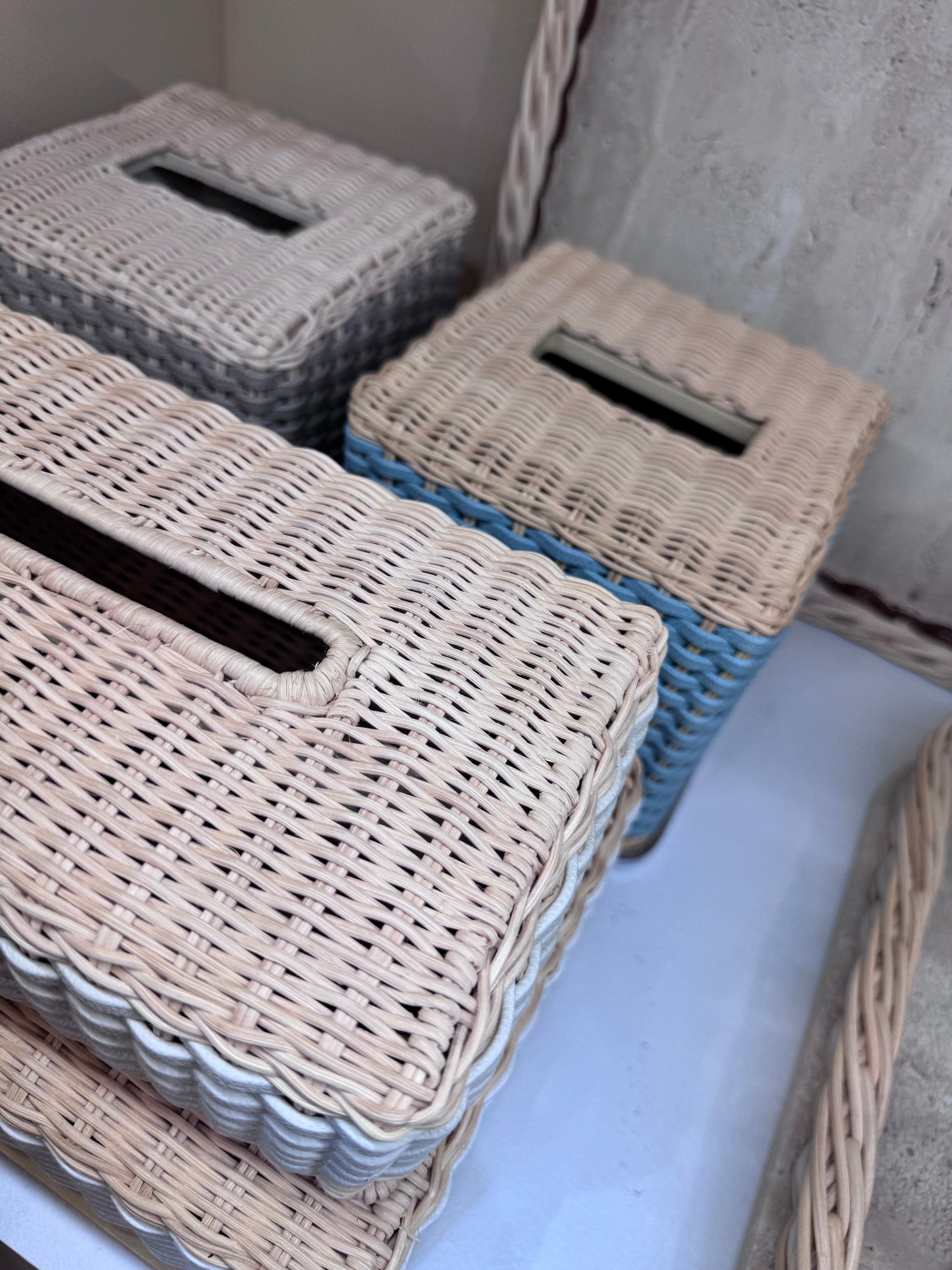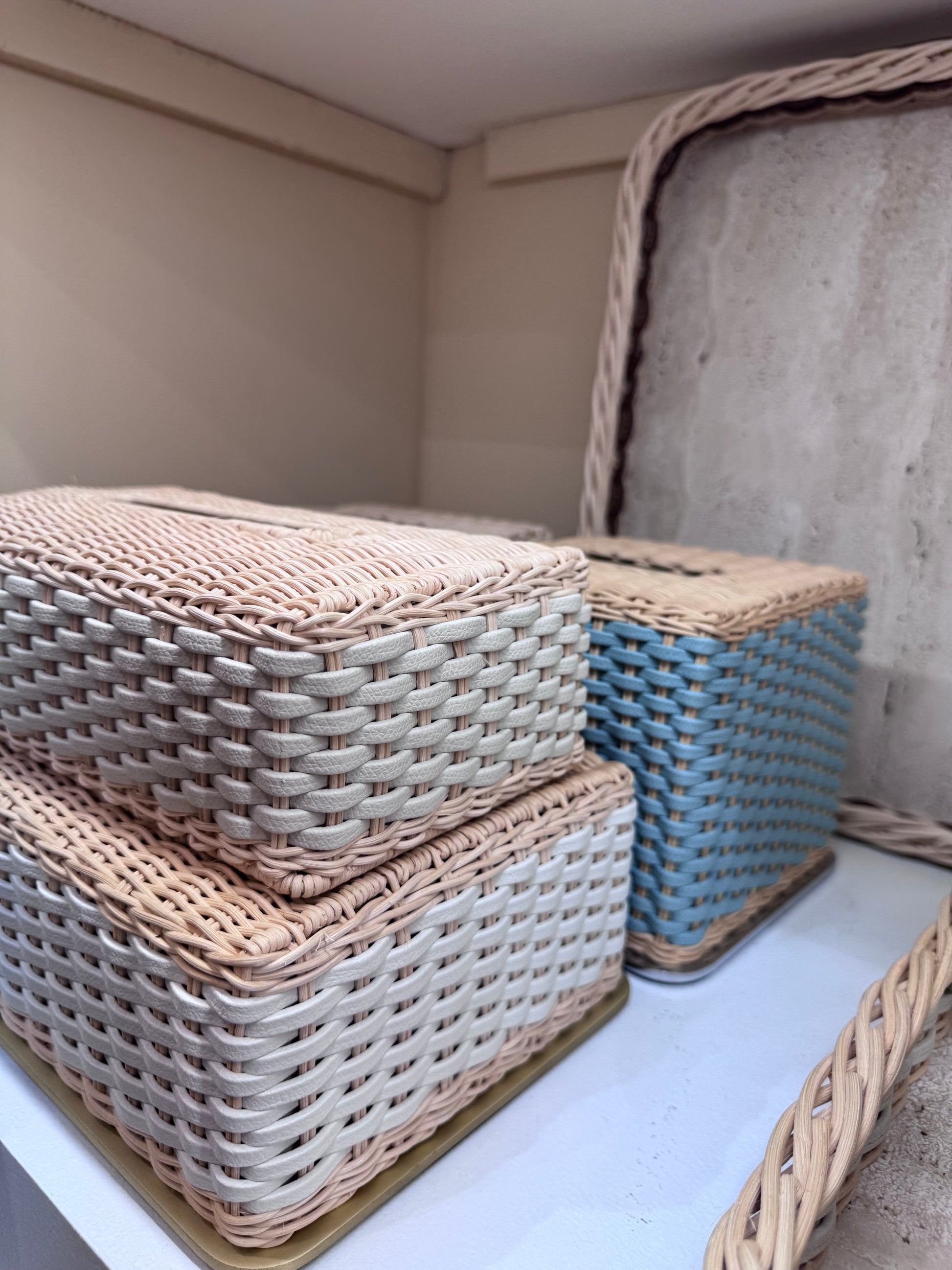 Elevate your everyday ritual with the Antibes Leather & Rattan Tissue Holder by Pigment France.