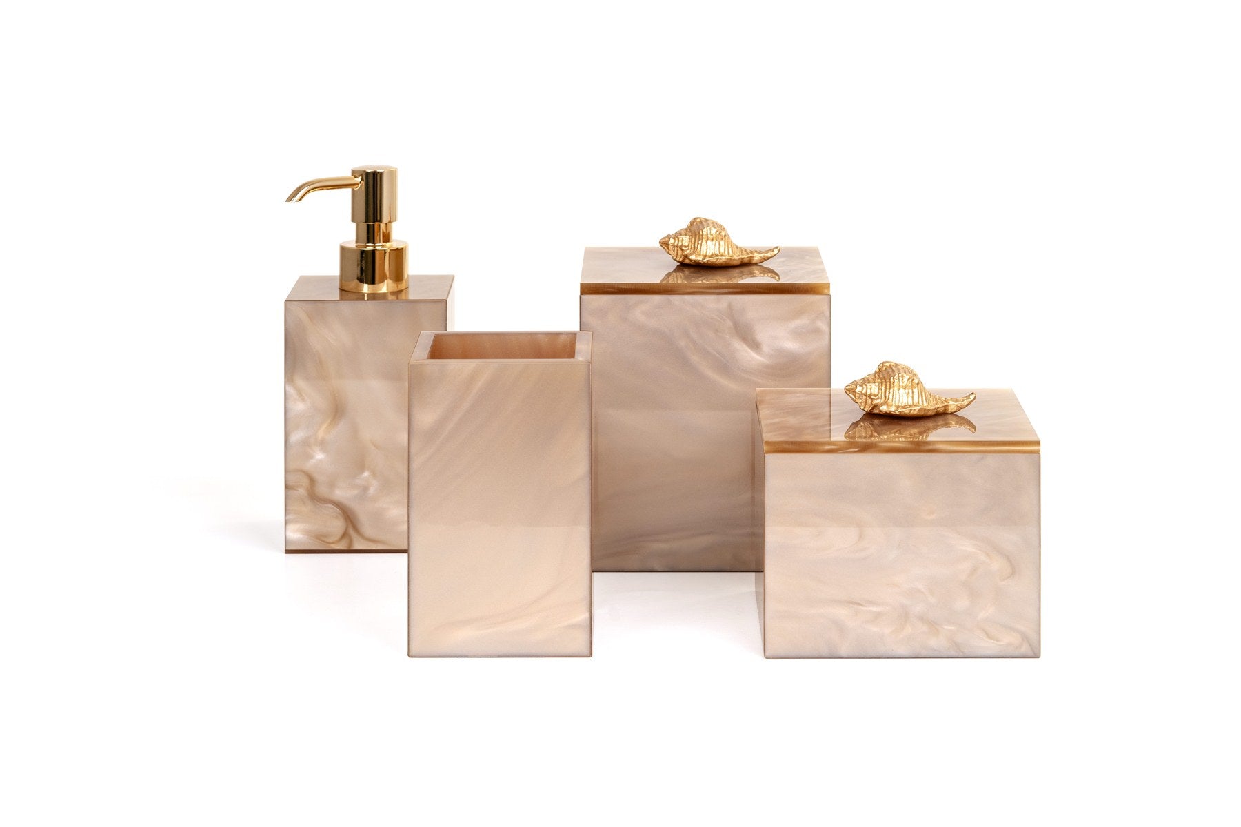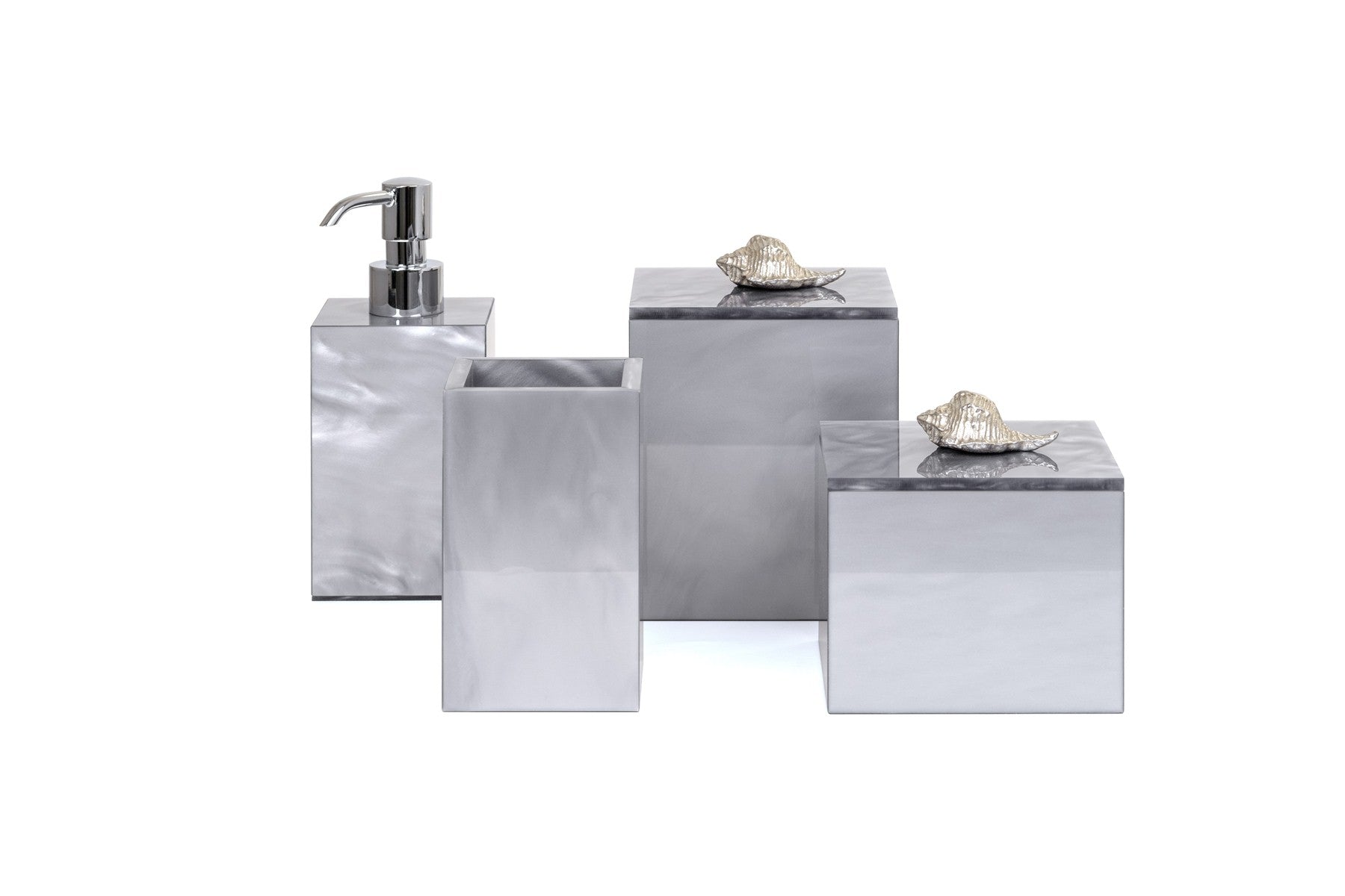 The Bea Square Box by Pinetti combines practicality and beauty. Its sleek resin design, finished in chrome or gold, makes it the perfect storage solution for any bathroom while enhancing your décor.