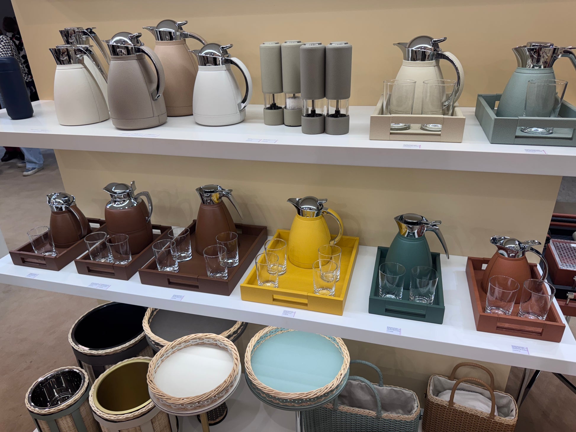 - Partially leather-covered insulated stainless steel carafes with chrome-plated finish
