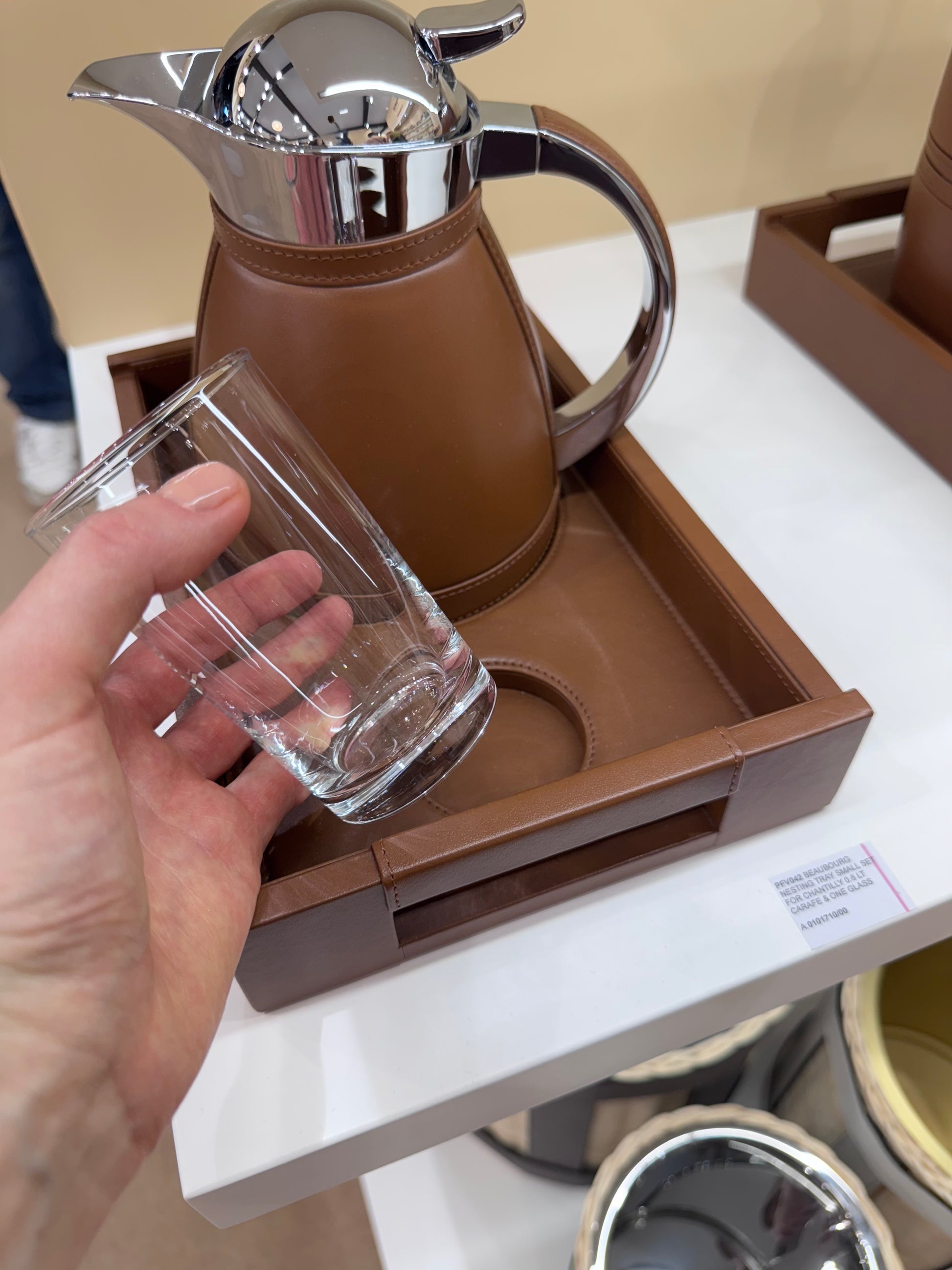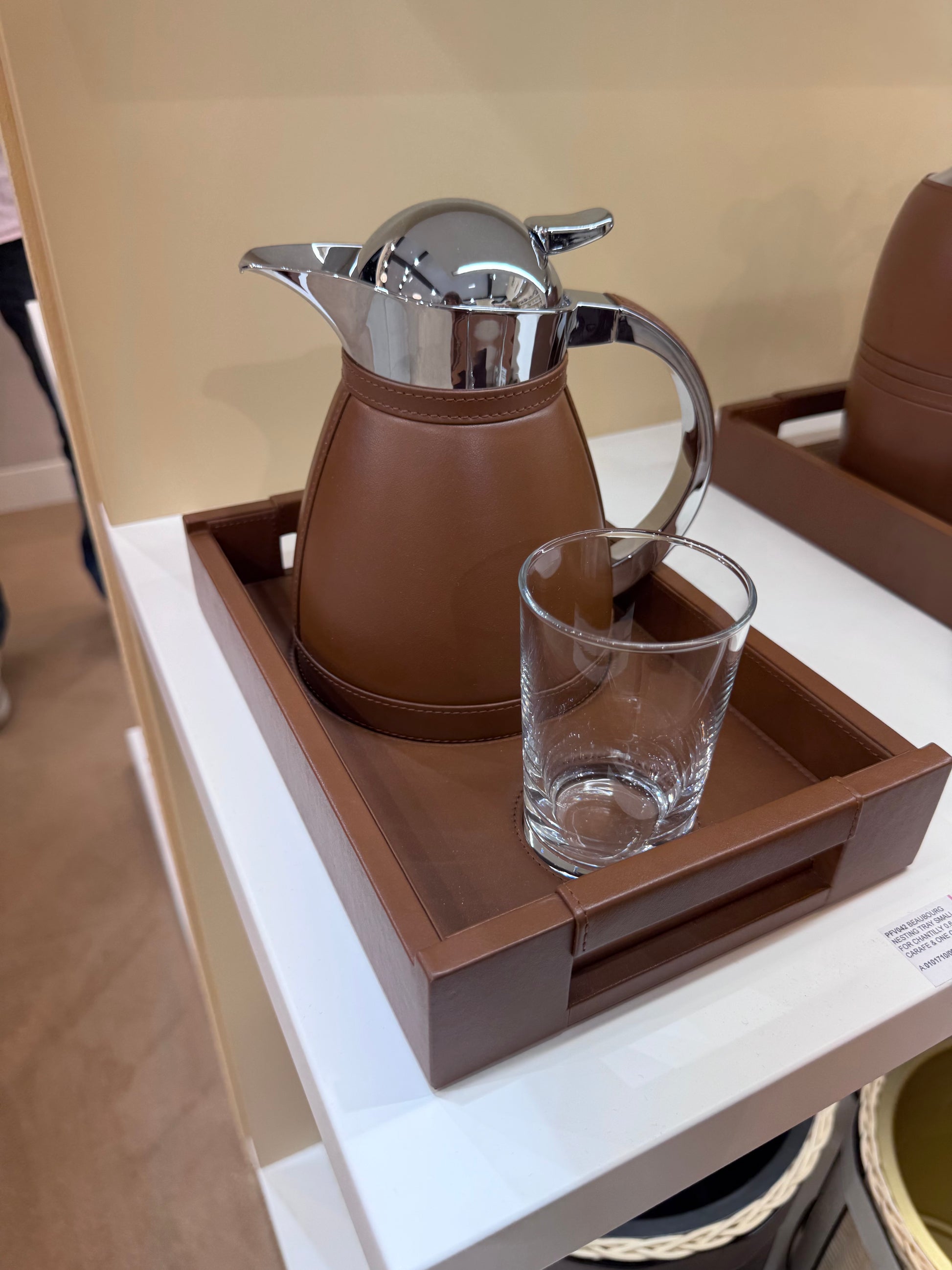 The Beaubourg Nesting Tray Set by Pigment France is a sophisticated ensemble that includes a small leather-covered Beaubourg tray designed to securely hold one fine crystal glass and a 0.6 L carafe (choose from Chantilly, Monceau, or Vincennes). The carafes are crafted from partially leather-covered insulated stainless steel with a chrome-plated finish, making them perfect for keeping your beverages at the right temperature. The elegant leather-covered wood tray enhances stability and style, offering a luxurious touch to any setting.