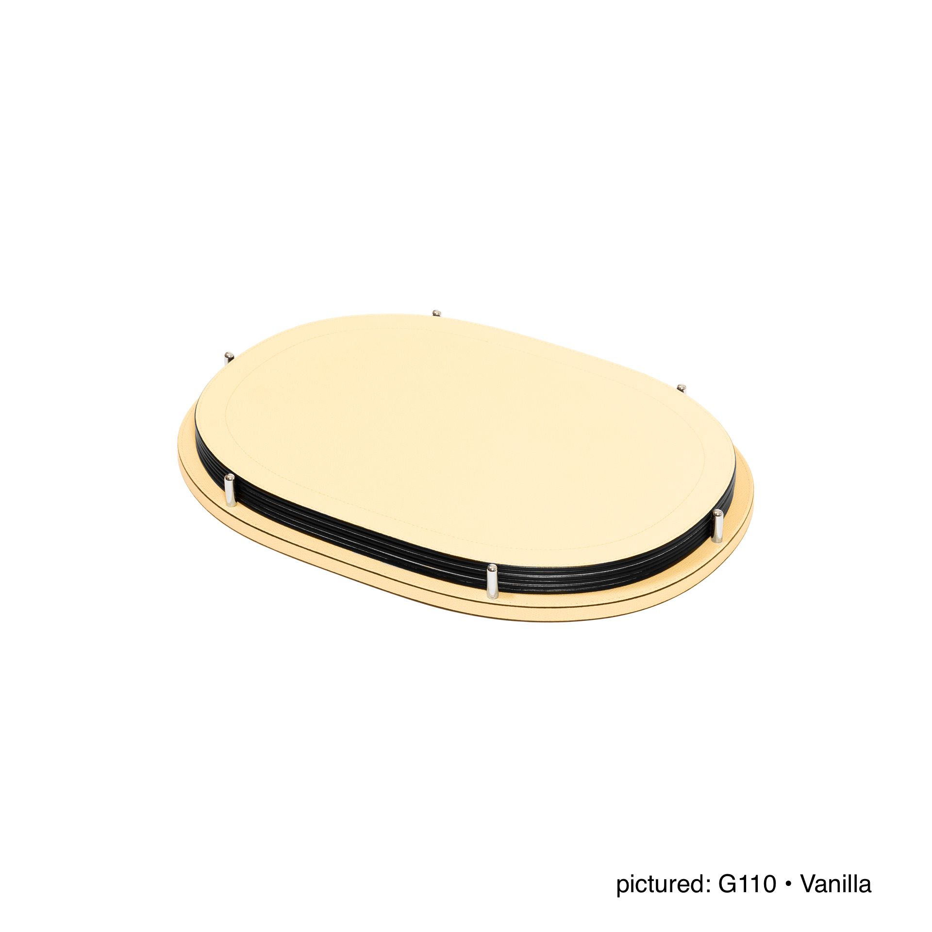 The David Placemat Holder is conceived as a functional table object where leather, proportion, and construction work together with quiet precision. The leather-covered base holds six placemats in place through discreet polished pins, keeping the surface composed without drawing attention to the mechanism itself.