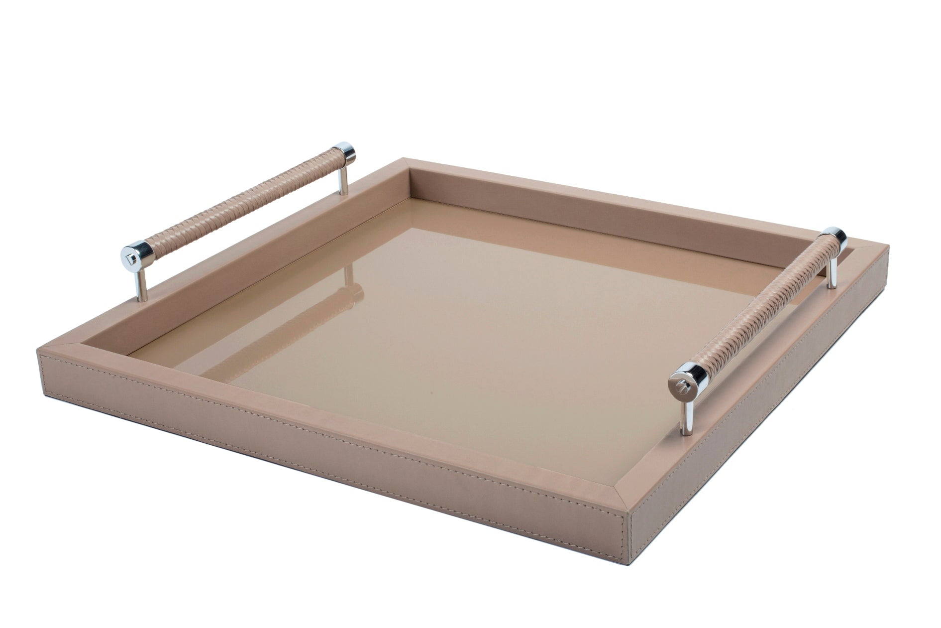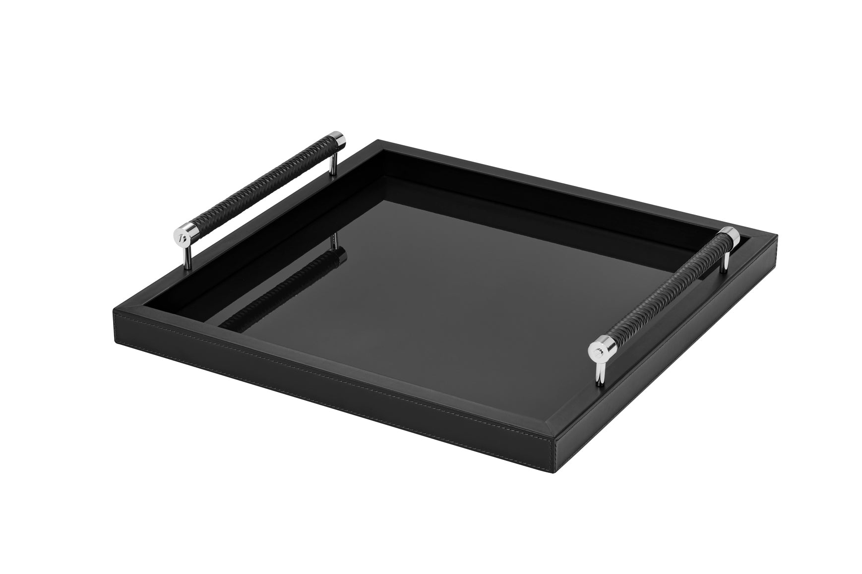 RIVIERE – Diana Lacquer Wood Tray with Leather Handles Square Chrome