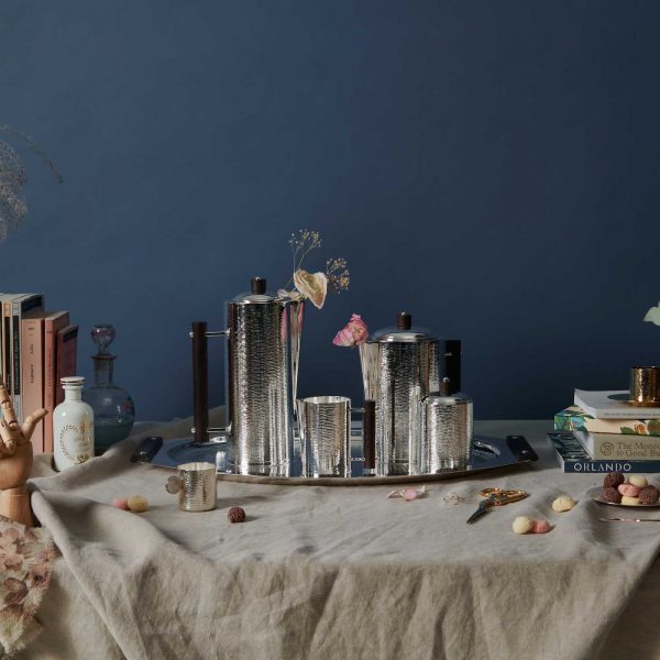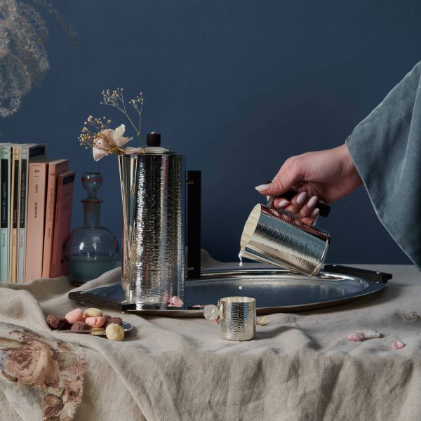 The Ebony Metal Tea Set by Zanetto exemplifies artisanal craftsmanship with its hand-hammered silver alloy and elegant ebony wood details. This exclusive five-piece set combines timeless sophistication and luxury, featuring a coffee pot, tea pot, milk jug, sugar jar, and rectangular tray, each adorned with striking ebony accents.