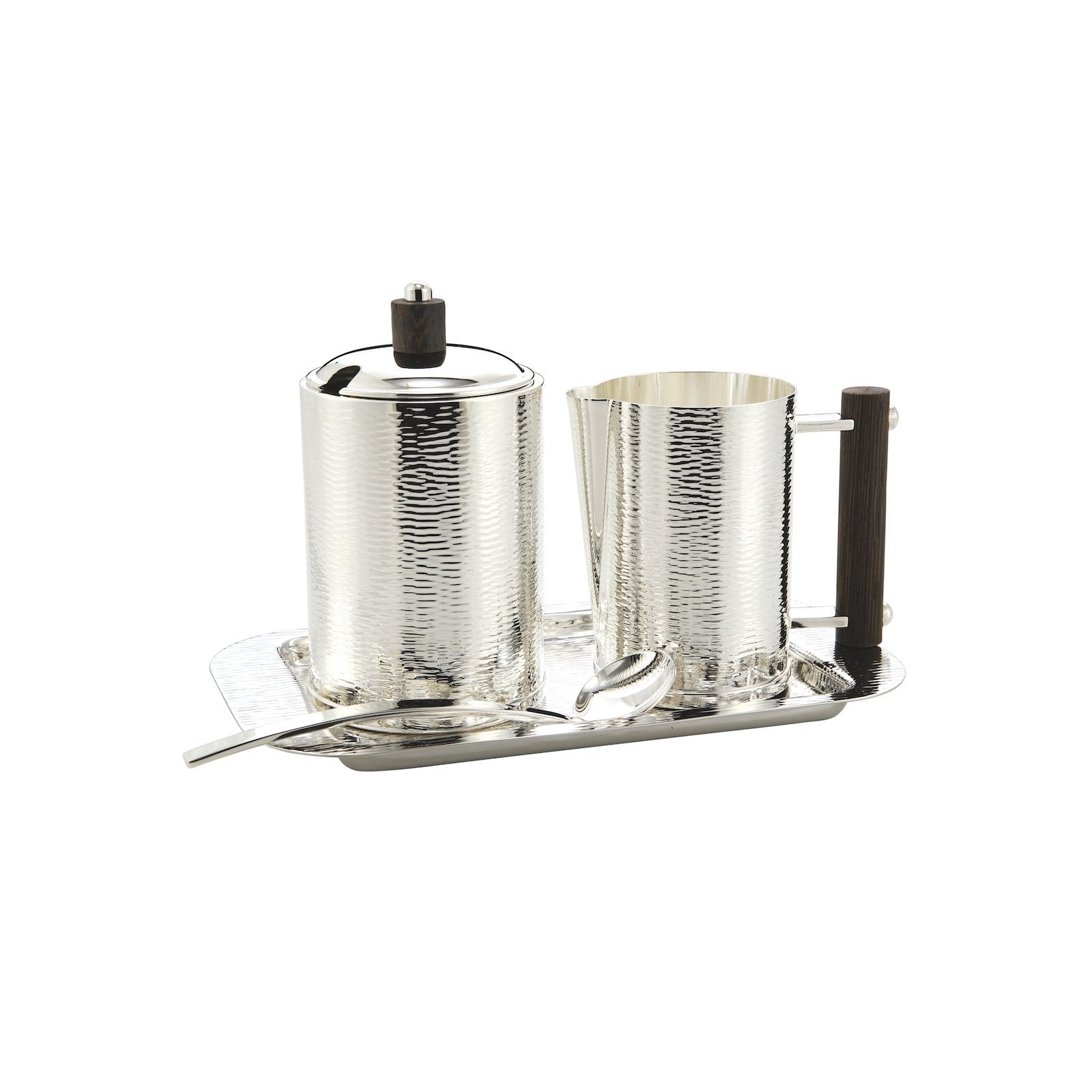 The Ebony Metal Breakfast Set by Zanetto features four exquisite pieces crafted from hand-hammered silver alloy, with precious ebony wood details on the milk jug, sugar jar, and small rectangular tray. The spoon, although crafted in silver alloy, complements the set’s luxurious design, making each piece a blend of elegance and functional sophistication.