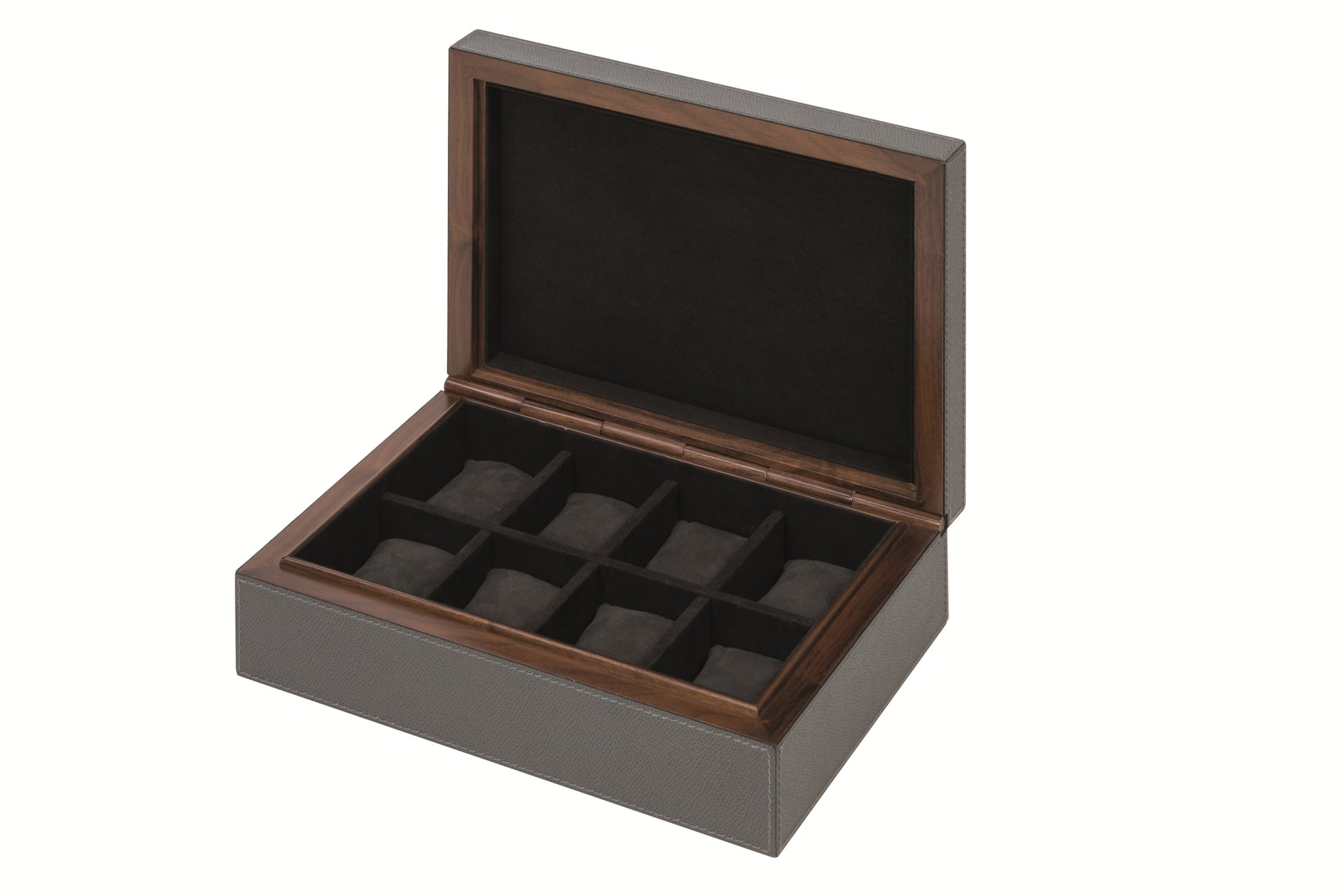 Frank Watches Box by Giobagnara merges meticulous craftsmanship with timeless design, creating an elegant solution for watch aficionados. Wrapped in premium leather and fitted with a durable walnut hinge, this box comfortably accommodates eight timepieces on plush padded cushions. Its sophisticated aesthetic and functional layout ensure each watch is stored and displayed with the utmost care.