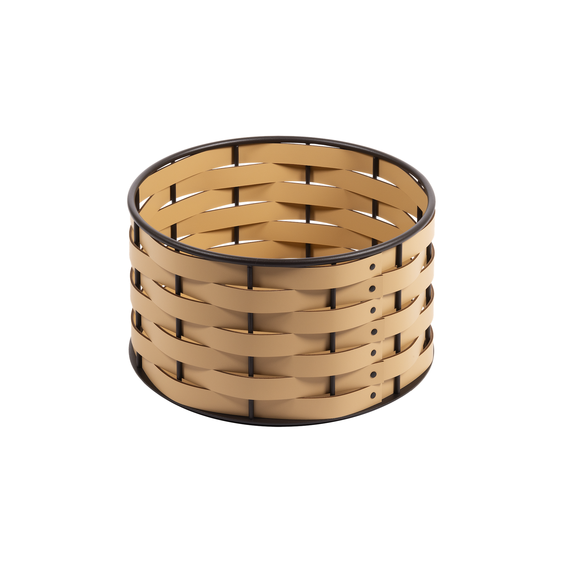 Nassa Storage Basket: Dark-Stained Aluminum Framework, Regenerated Leather Weaving, Round Low