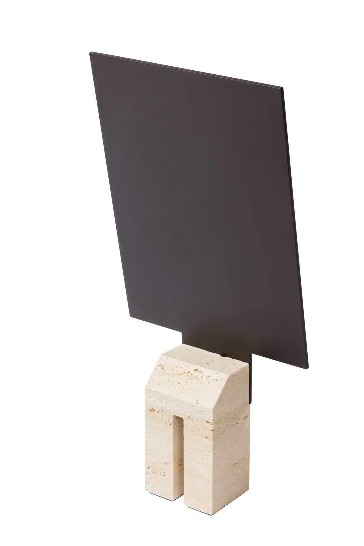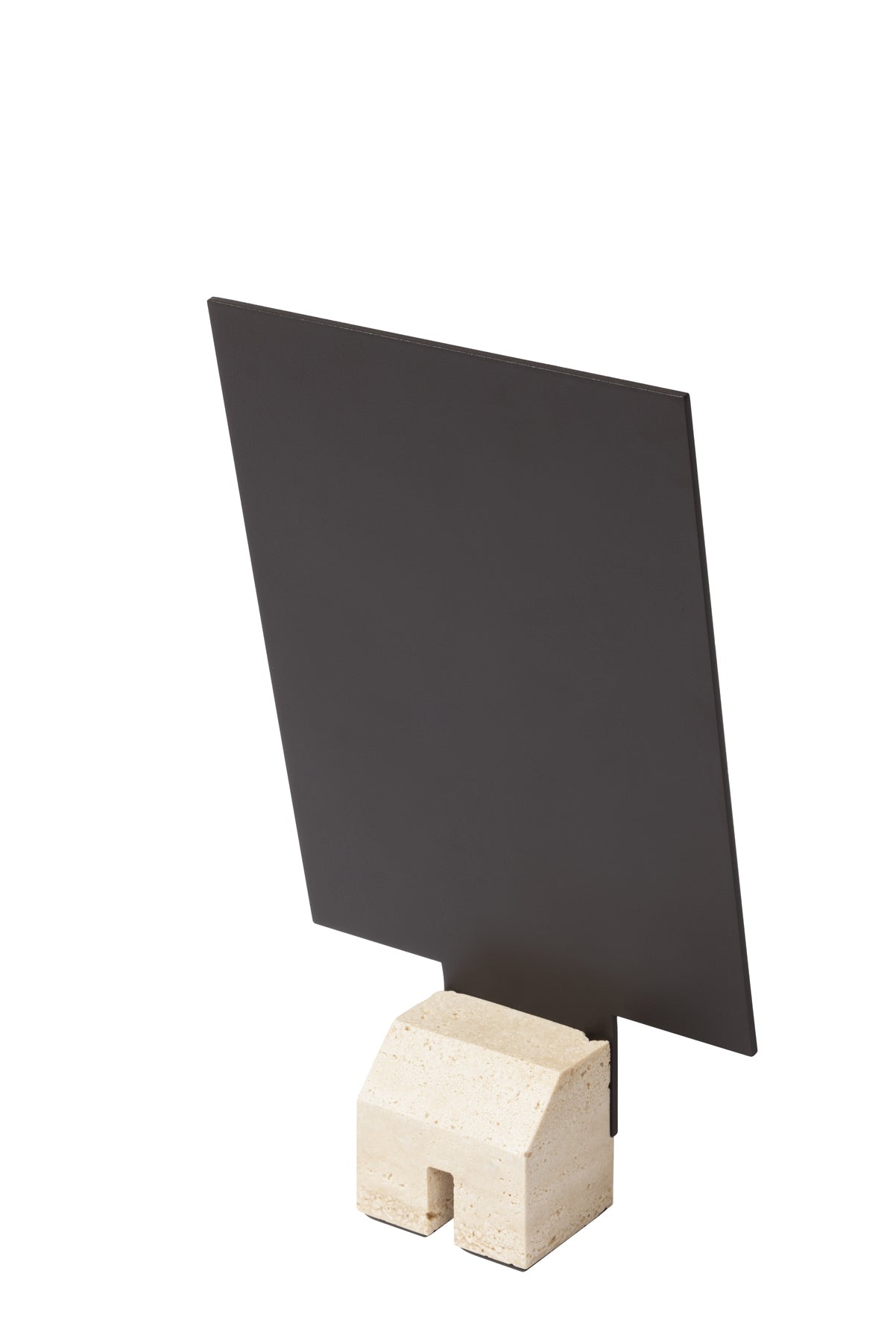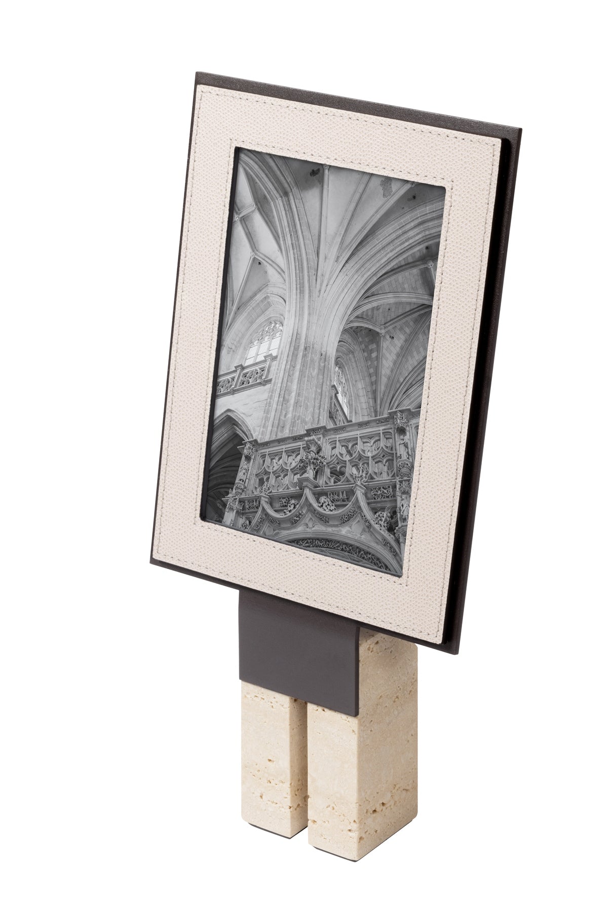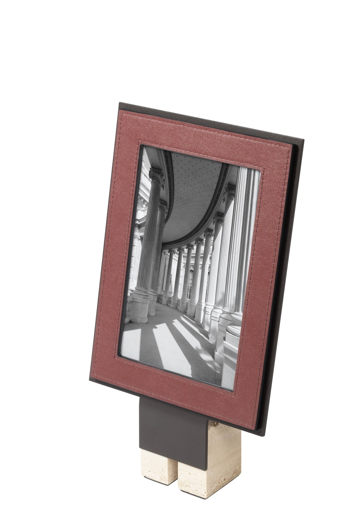 The Pillar Leather Picture | Menu Frame Stand by Giobagnara, designed by Simone Fanciullacci, blends sophistication with modern design. Featuring a metal frame with luxurious leather or leather-travertine accents, its distinctive monolithic base evokes classical architectural strength and elegance. Perfect for displaying pictures, menus, or hospitality information, Pillar offers versatile options for both modern and timeless interiors.