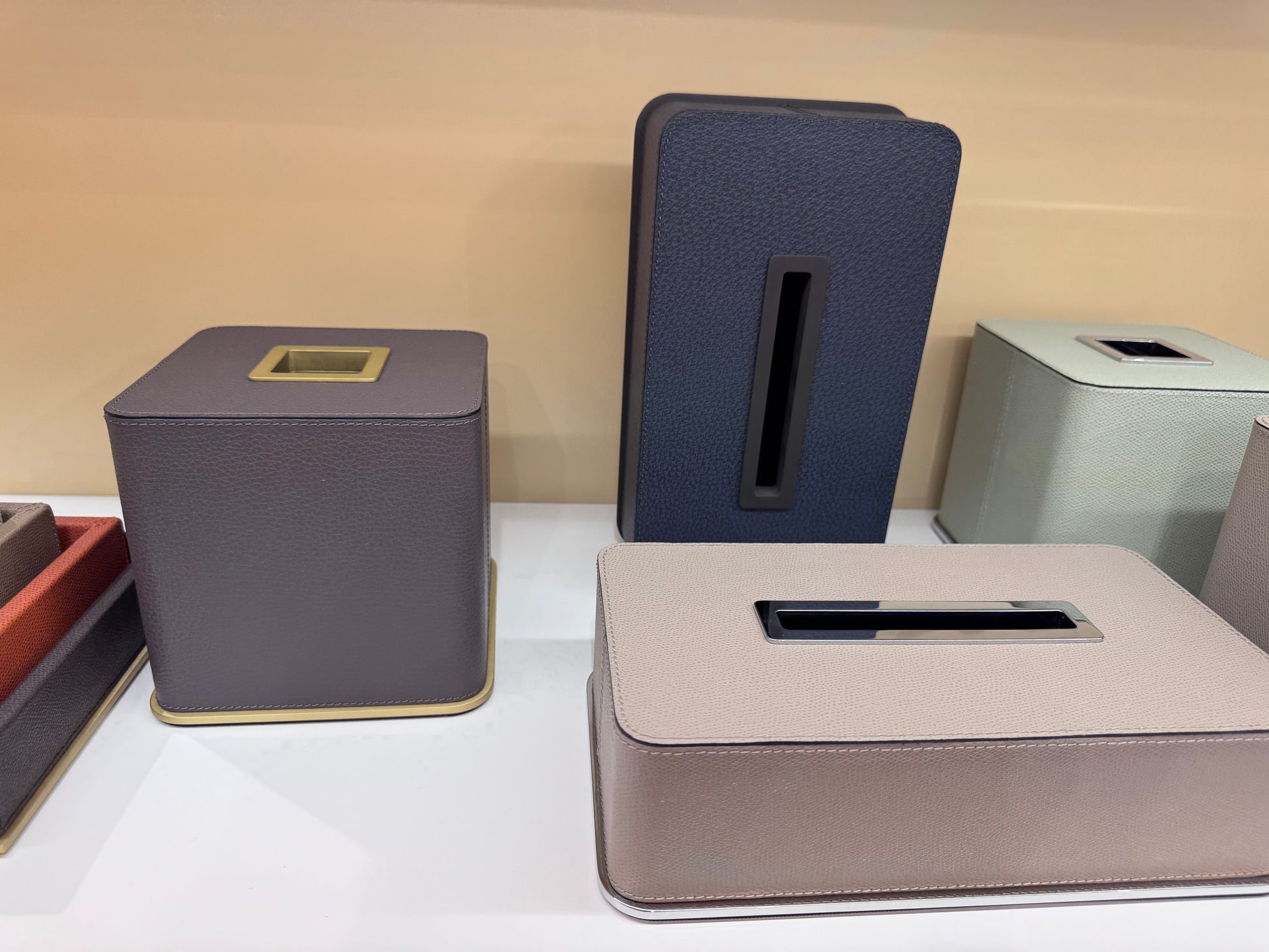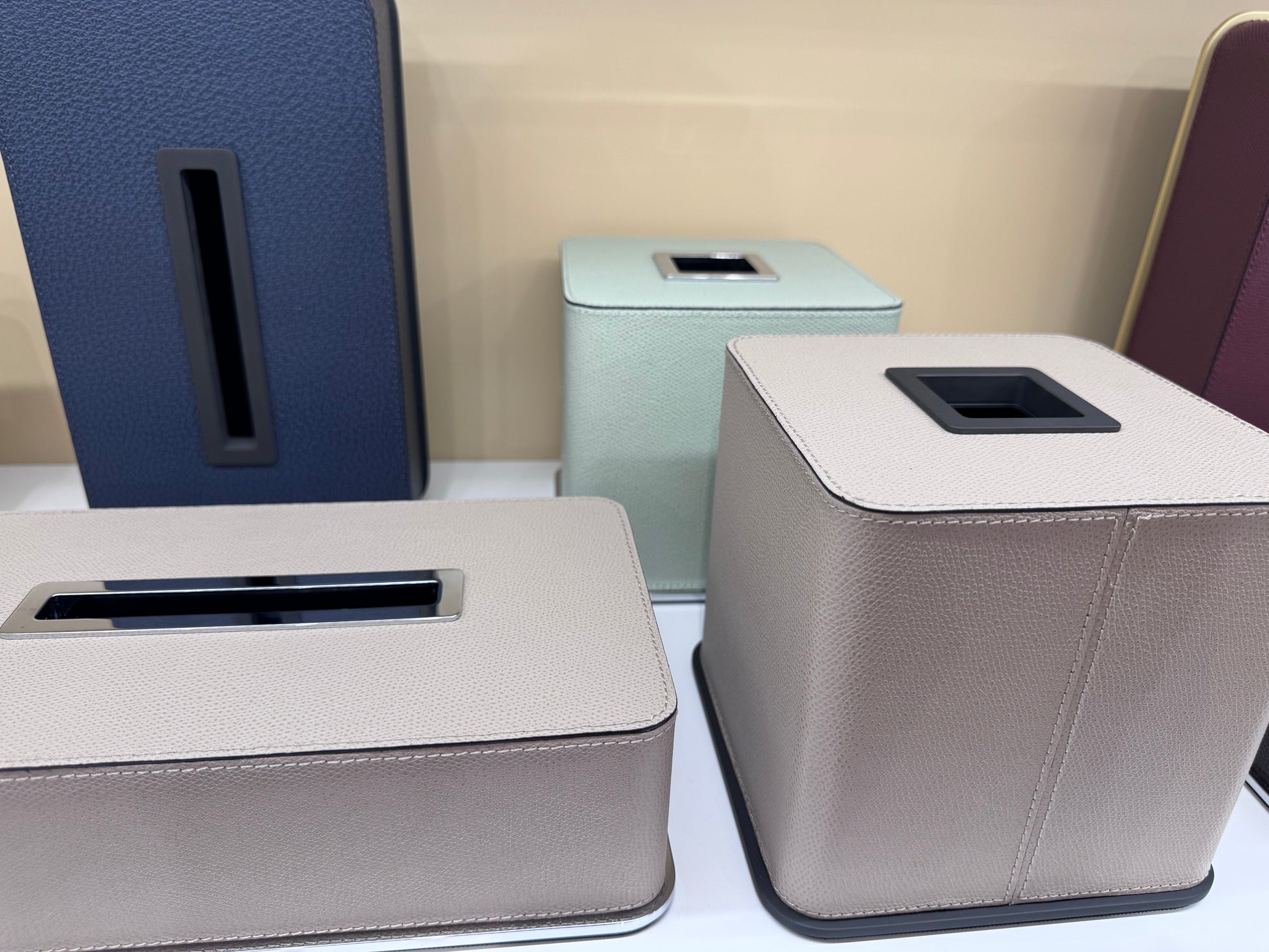 The Polo tissue holder by Giobagnara unites a simple form with leather covering and a discreet metal frame. It adapts seamlessly to bathroom or desk settings. 2Jour Concierge uses the square version for bedside tables and the rectangular version for shared washrooms.