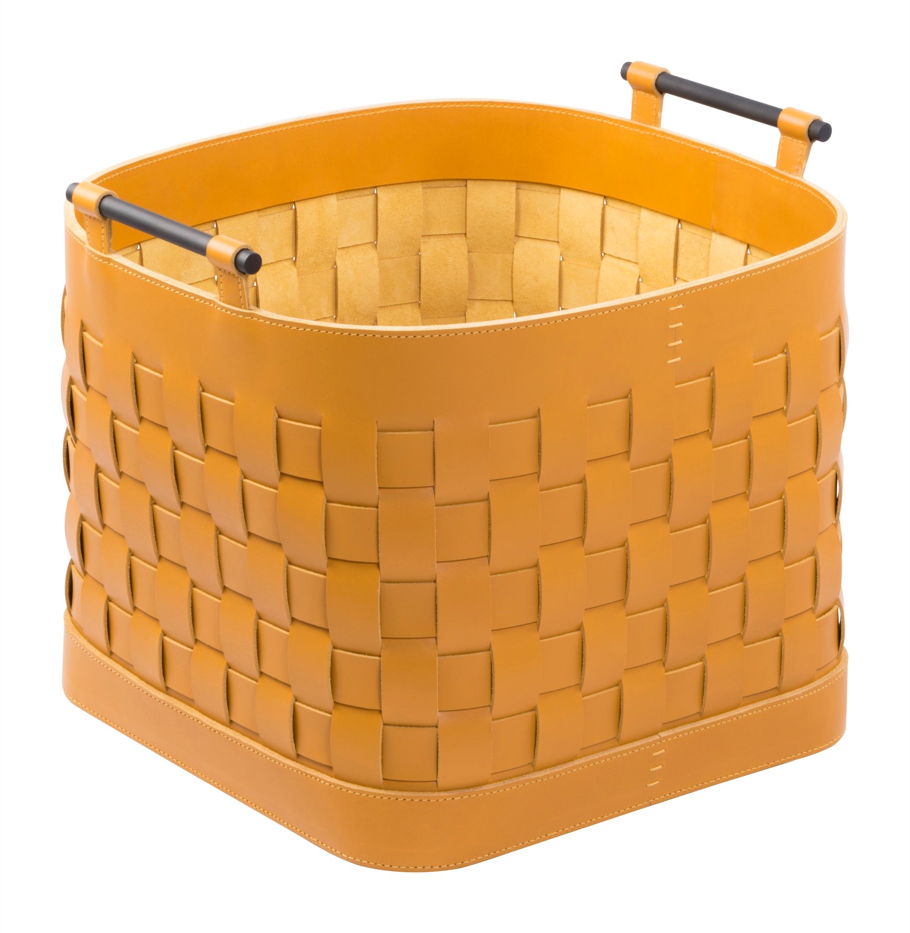 Ravenna Braided Leather Storage Basket, Square Tall with Brushed Bronze Handles