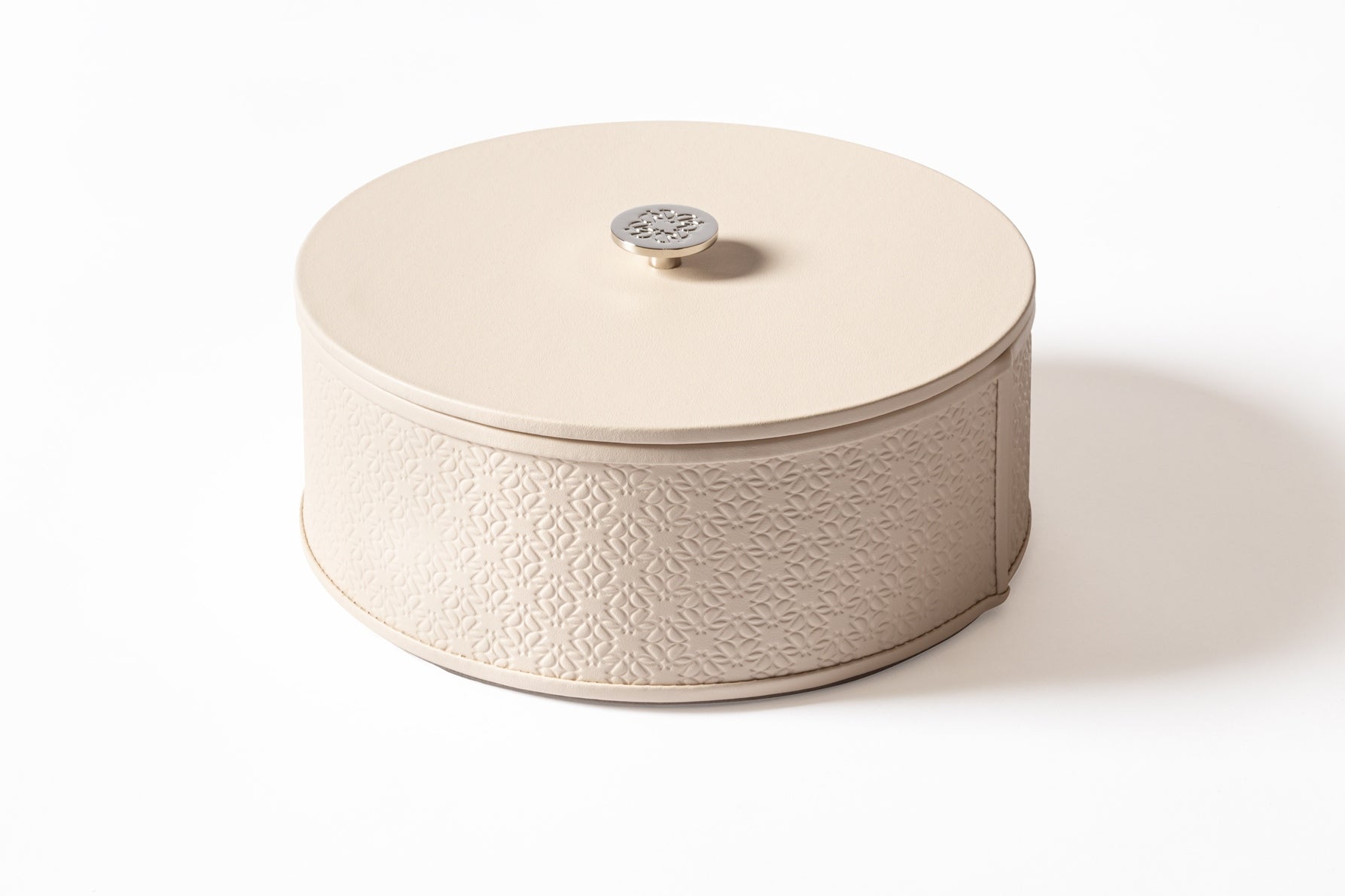 The Monogram Trinket Box Round by Giobagnara x Elie Saab features a sumptuous leather exterior with a padded finish adorned with the exclusive Elie Saab Monogram pattern. The lid boasts a polished palladium carved detail, adding a touch of refined luxury to this elegant round box.