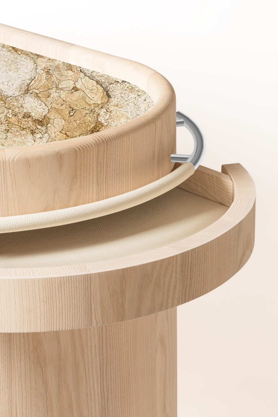 - Leather-covered lower level with a centered wooden platform