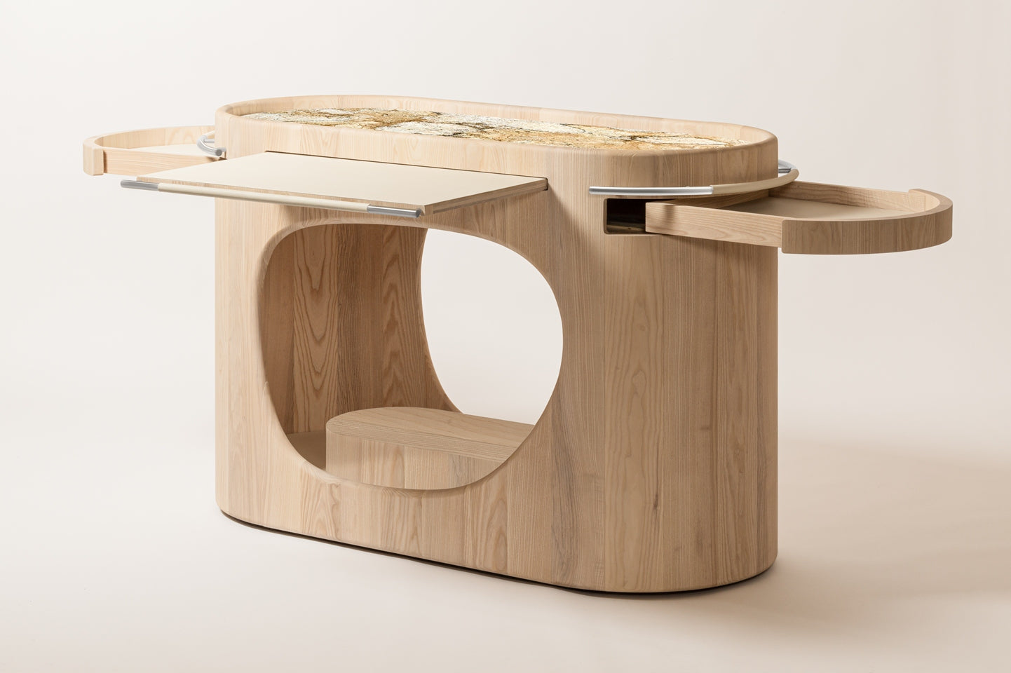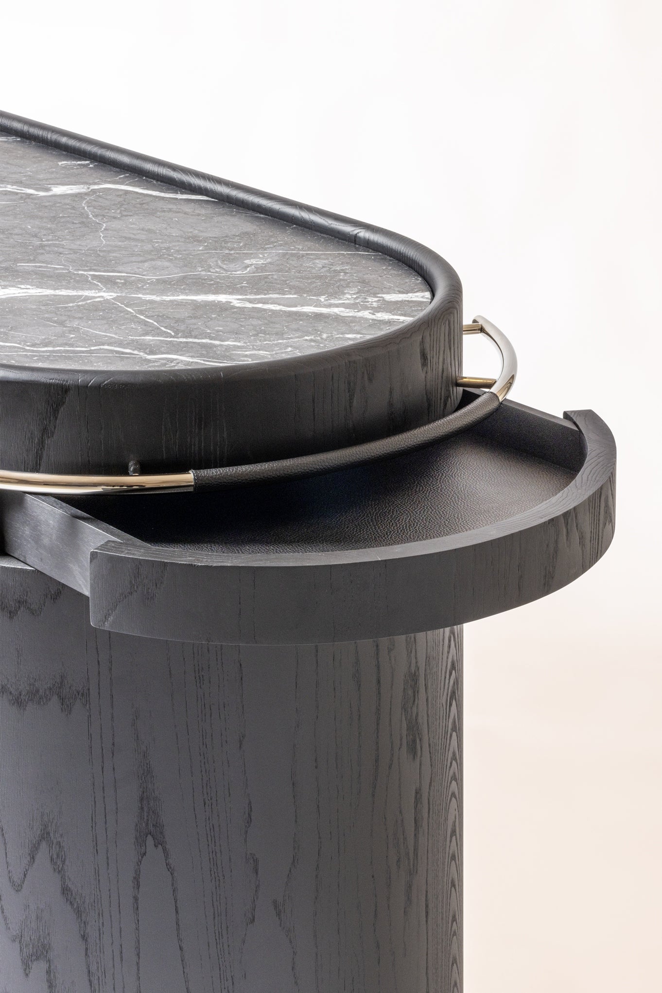The Maris Bar Cart by Giobagnara x Kelly Wearstler embodies luxury and functionality in a seamless design. Featuring a marble top, leather accents, and a solid wood structure, it offers a sophisticated touch to any space. Its pull-out shelf and ample storage make it perfect for both preparation and display, elevating every hosting experience.